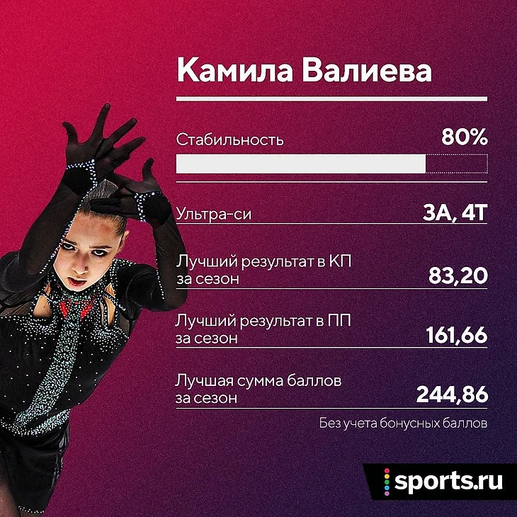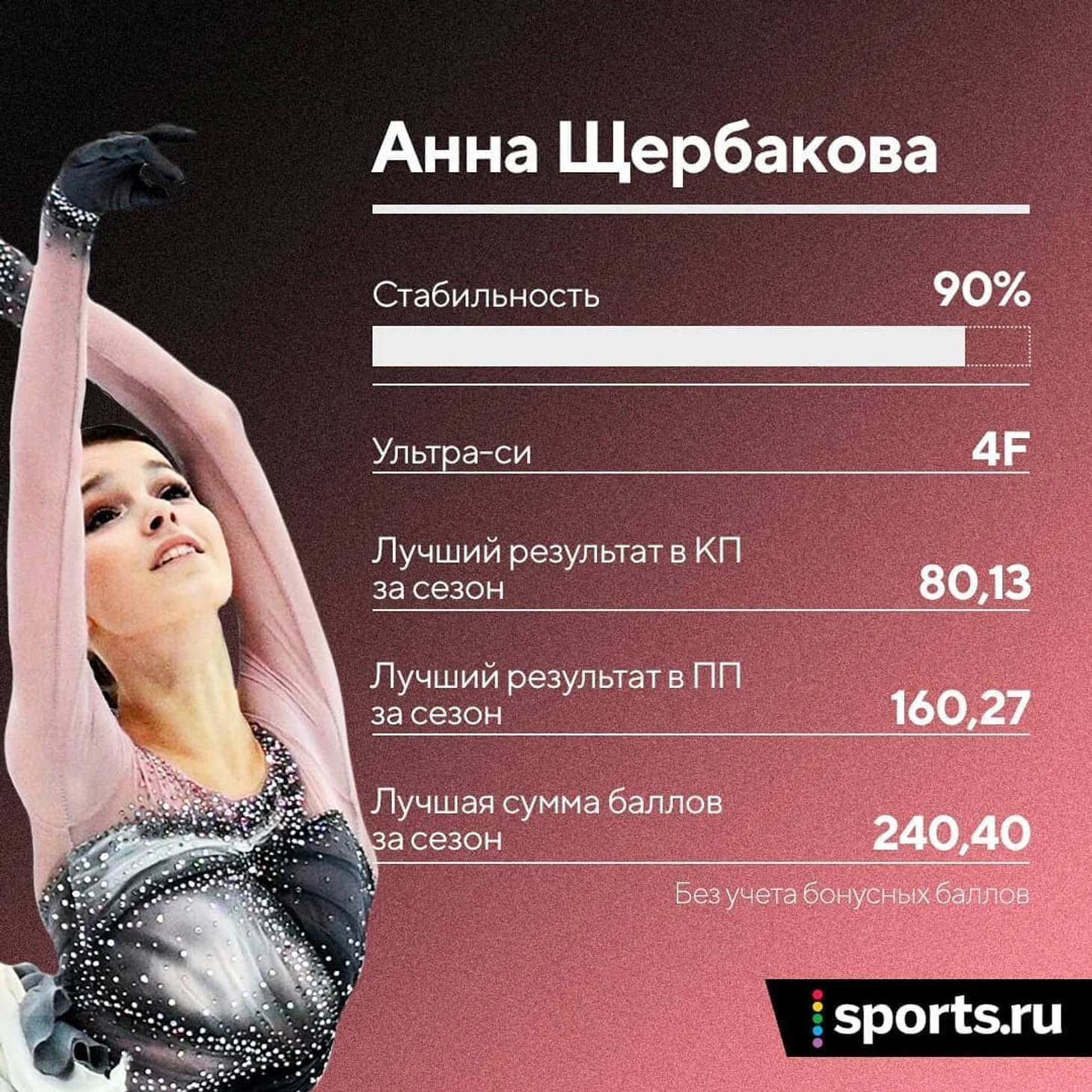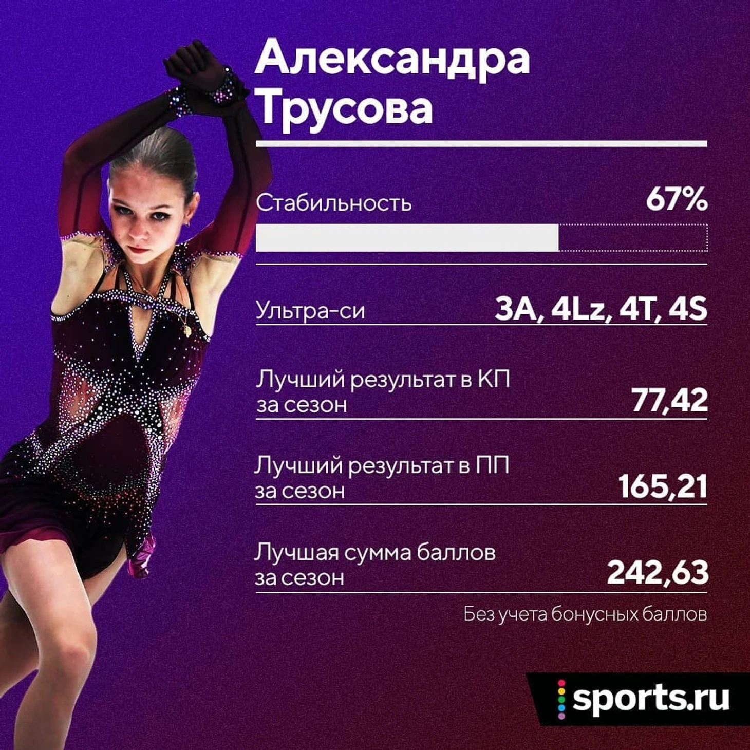 Даже несмотря на провальное выступление на этапе Гран-при в Москве, где Саша допустила 4 падения в произвольной и не попала в топ-3 (198,93 по сумме), лучший результат сезона Трусовой превосходит лучший результат Щербаковой: 248,63 против 246,40. Хотя сразу оговорка: лучший результат сезона у Камилы Валиевой – 254,86.