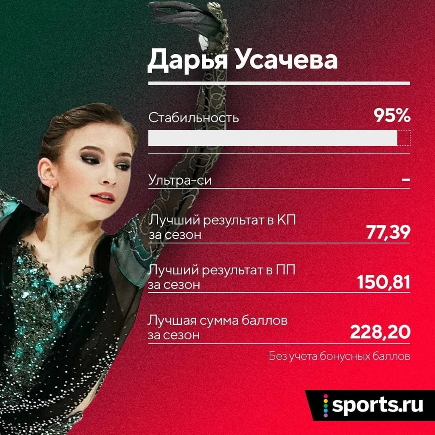 Или Дарья Усачева – еще одна юниорка Этери Тутберидзе, которая в этом сезоне получает очень щедрые бонусы от арбитров и имеет суммарный рекорд 233,2 балла.