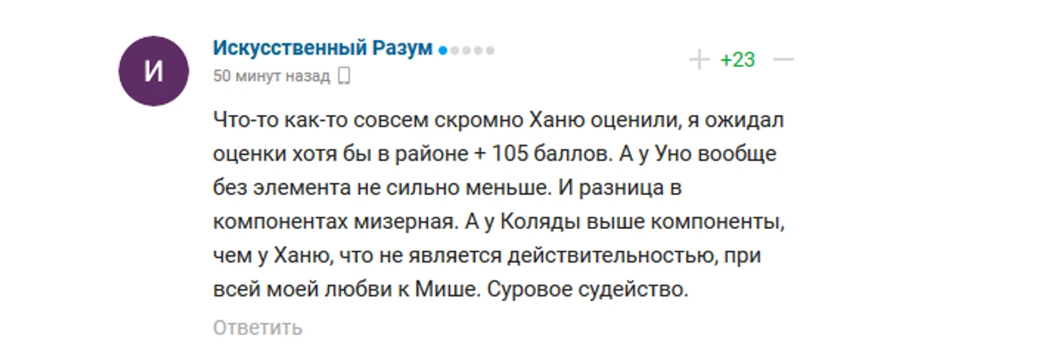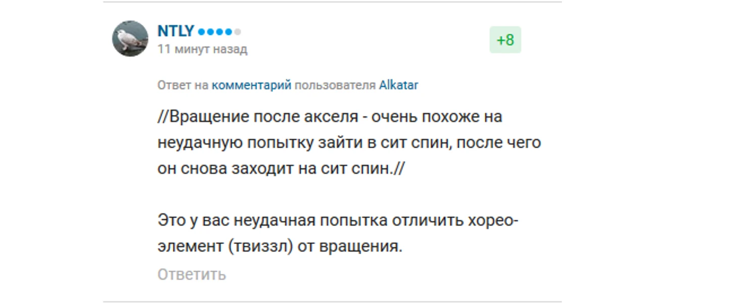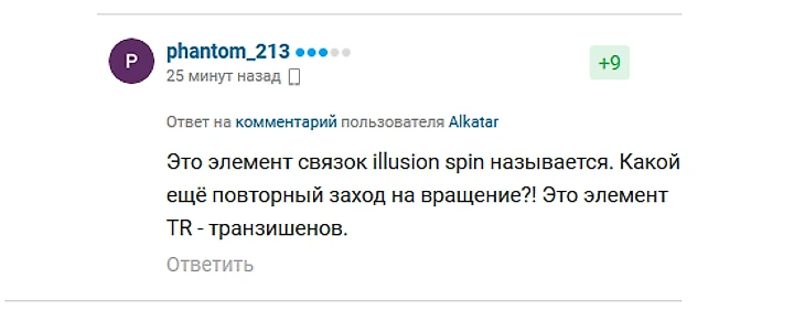 Однако вскоре вышли протоколы, из которых стало ясно, что один из элементов был полностью сорван. А именно обязательное в короткой программе вращение SSp.