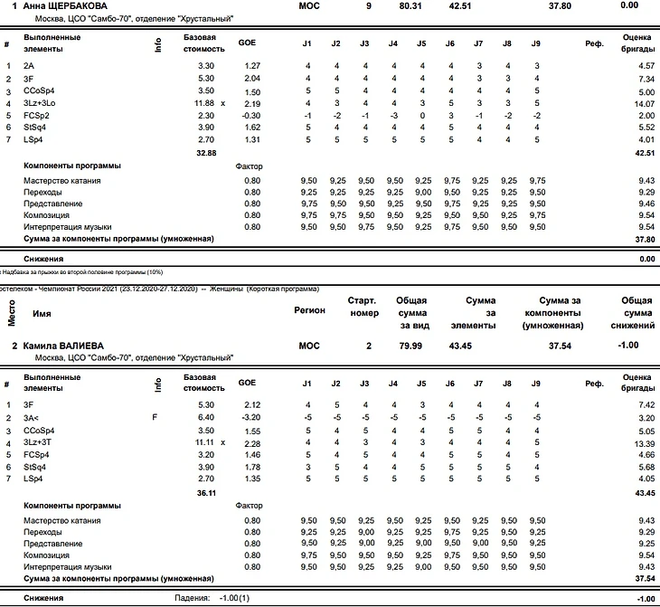 Oh, common! Really? Всем мало-мальски разбирающимся в скольжении людям видно: что у Валиевой, что у Щербаковой скольжение и переходы не являются сильными сторонами. Рёберности гениальной нет, в дорожках несколько вязнут, раскат не то, чтобы феноменальный. Откуда такие грибищи?! Кстати, забавно, что оценки за первые два компонента у девочек идентичные. Щербакова по итогам КП оказалась выше за счёт трёх других компонентов и штрафа Валиевой за падение (техникой Анна проиграла):