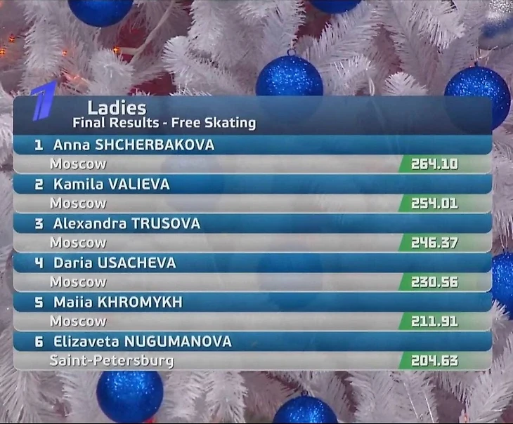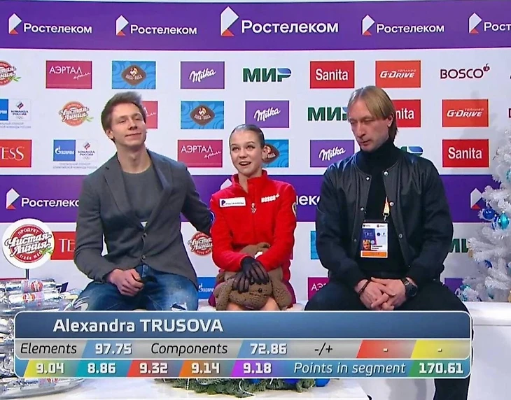 Но этого все равно не хватило Саше для победы. Вскоре мы сможем увидеть протоколы, но и во время эфира было видно, что дорожки шагов снова 3 уровня, а компоненты так же ниже, чем у соперниц. Это показывает, что ничего нового в катание Саши Евгений Плющенко не привнёс.