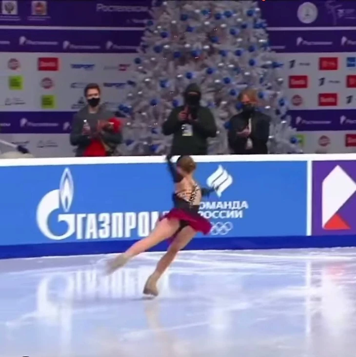Сегодня Саша чисто исполнила 2 четверных Лутца, один из которых в каскаде с тройным тулупом (сложнейший каскад в фигурном катании), но на риск пяти четверных не пошла.
