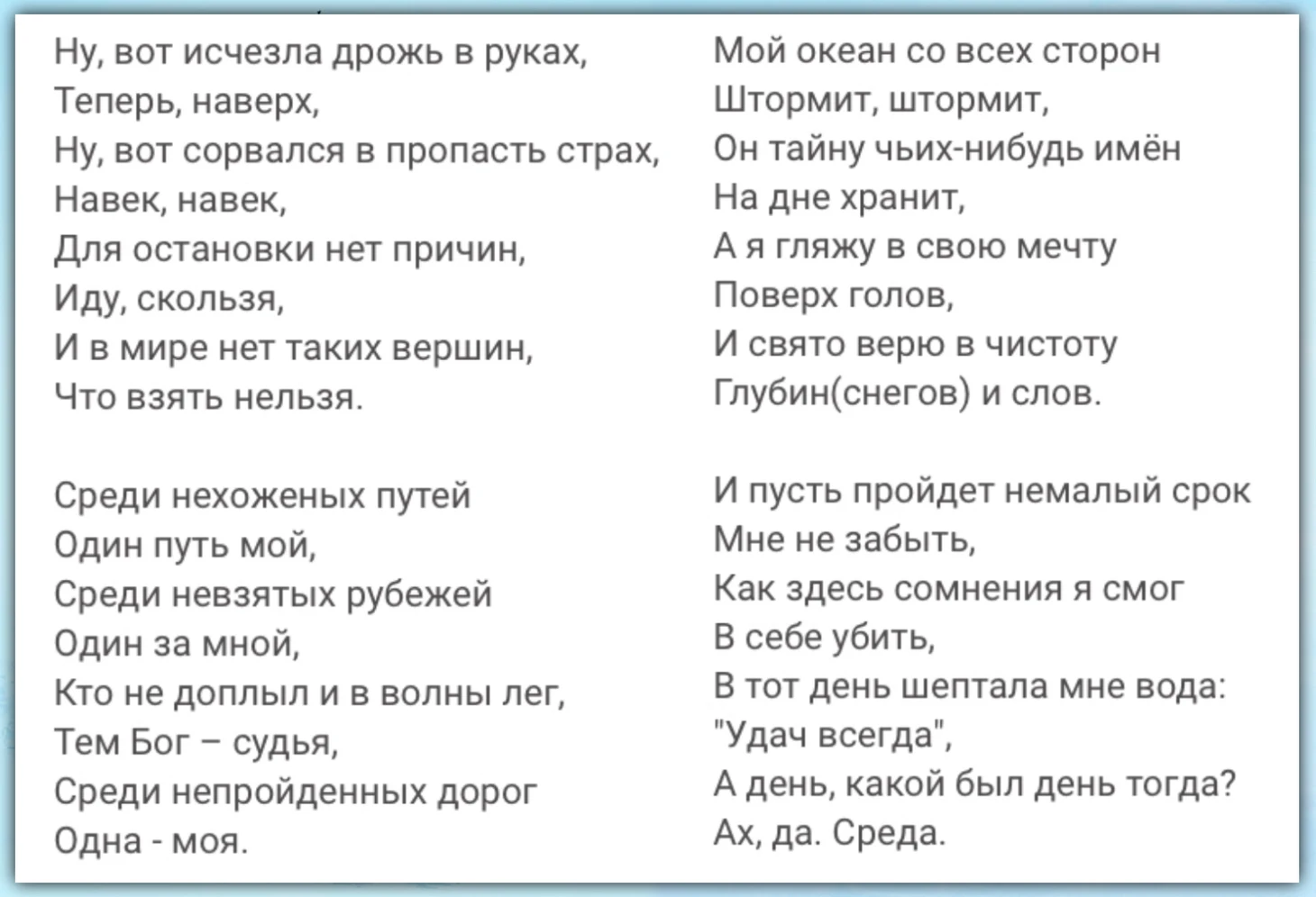 «Ну вот, исчезла дрожь в руках…»– Нерв. Варианты названия – «Горная лирическая», «Какой был день», «Ах да, среда», «В среду», «К вершине».