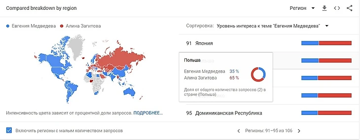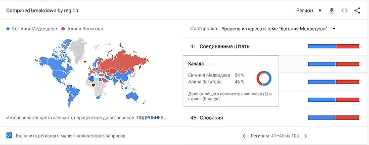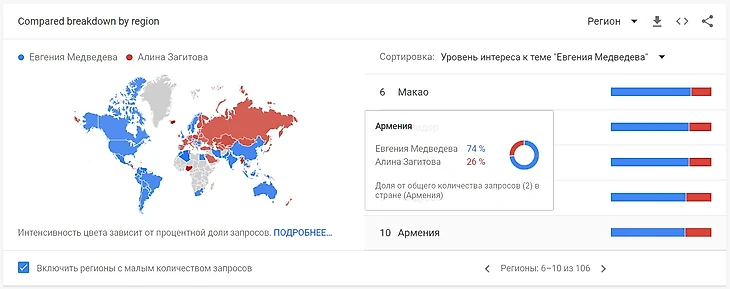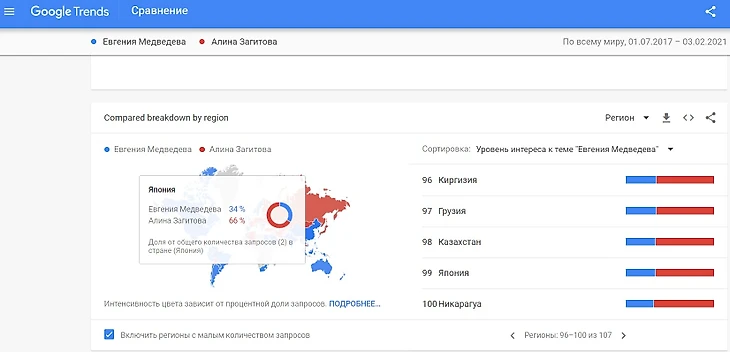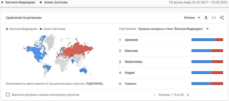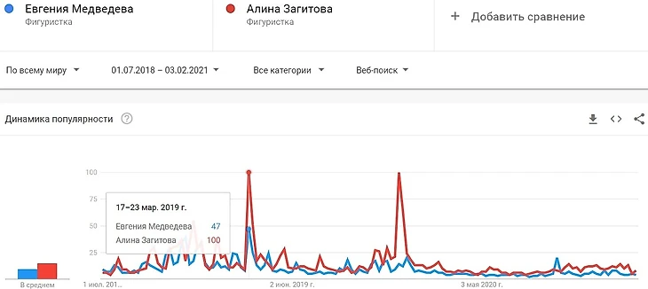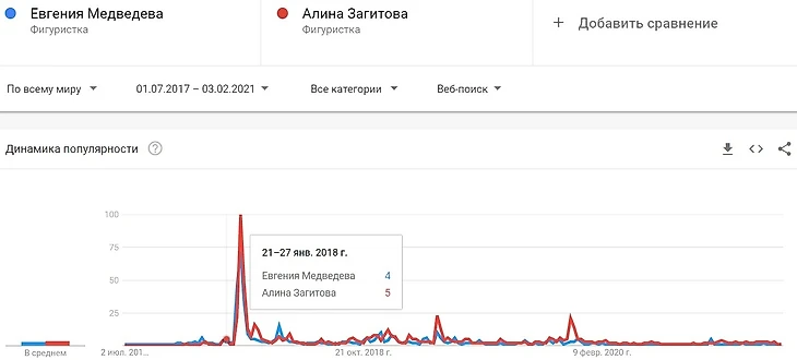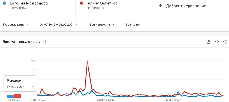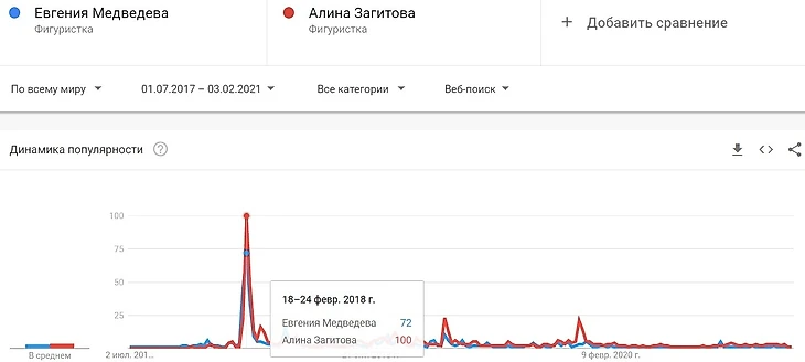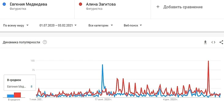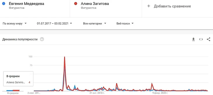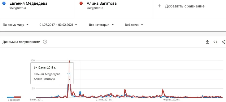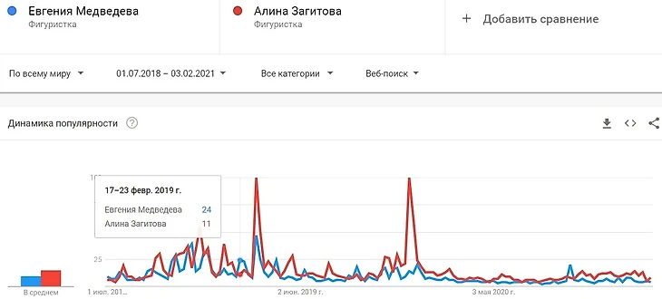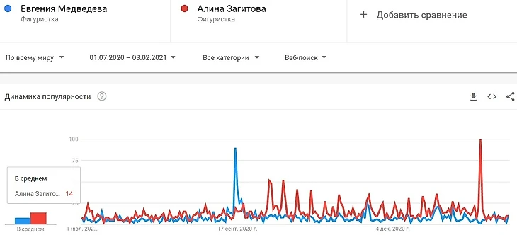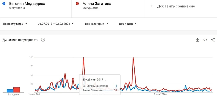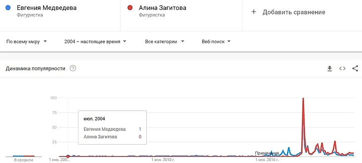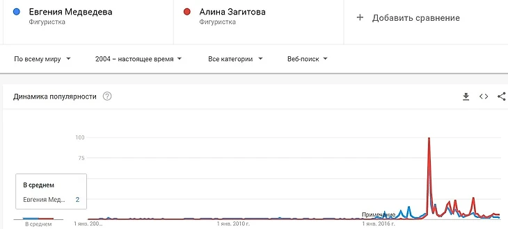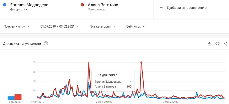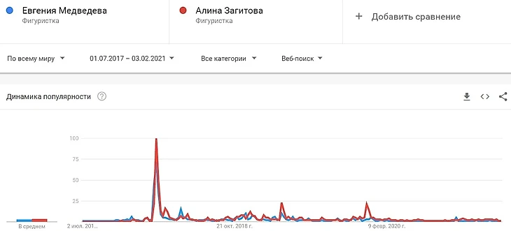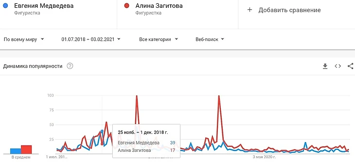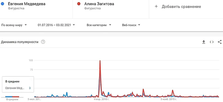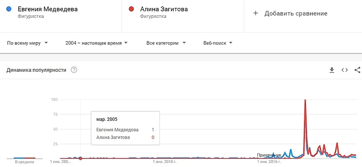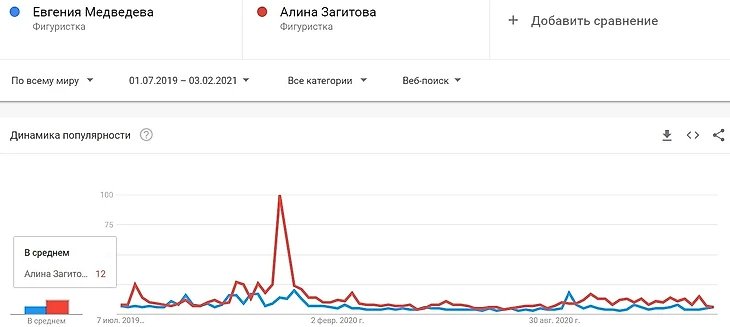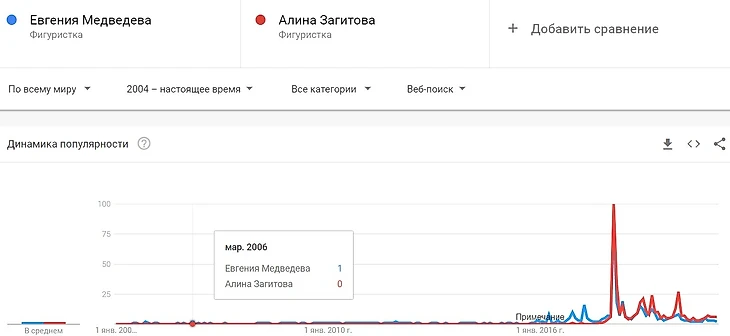 в)Нажимаете сравнить и указываете поисковый запрос "Алина Загитова" и выбираете "Алина Загитова (фигуристка)" - будет победным, красным цветом. Если Алину Загитову выбрать первой, то статистки по Алине будет отображаться синим цветом.(