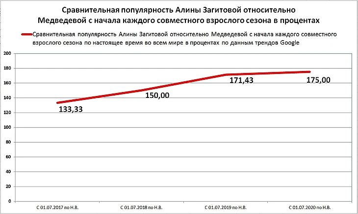 Таким образом, популярность Алины Загитовой относительно ЕМ с началом каждого взрослого сезона ВСЁ больше растёт, т.е. разрыв с каждым новым сезоном ВСЁ больше увеличивается!
