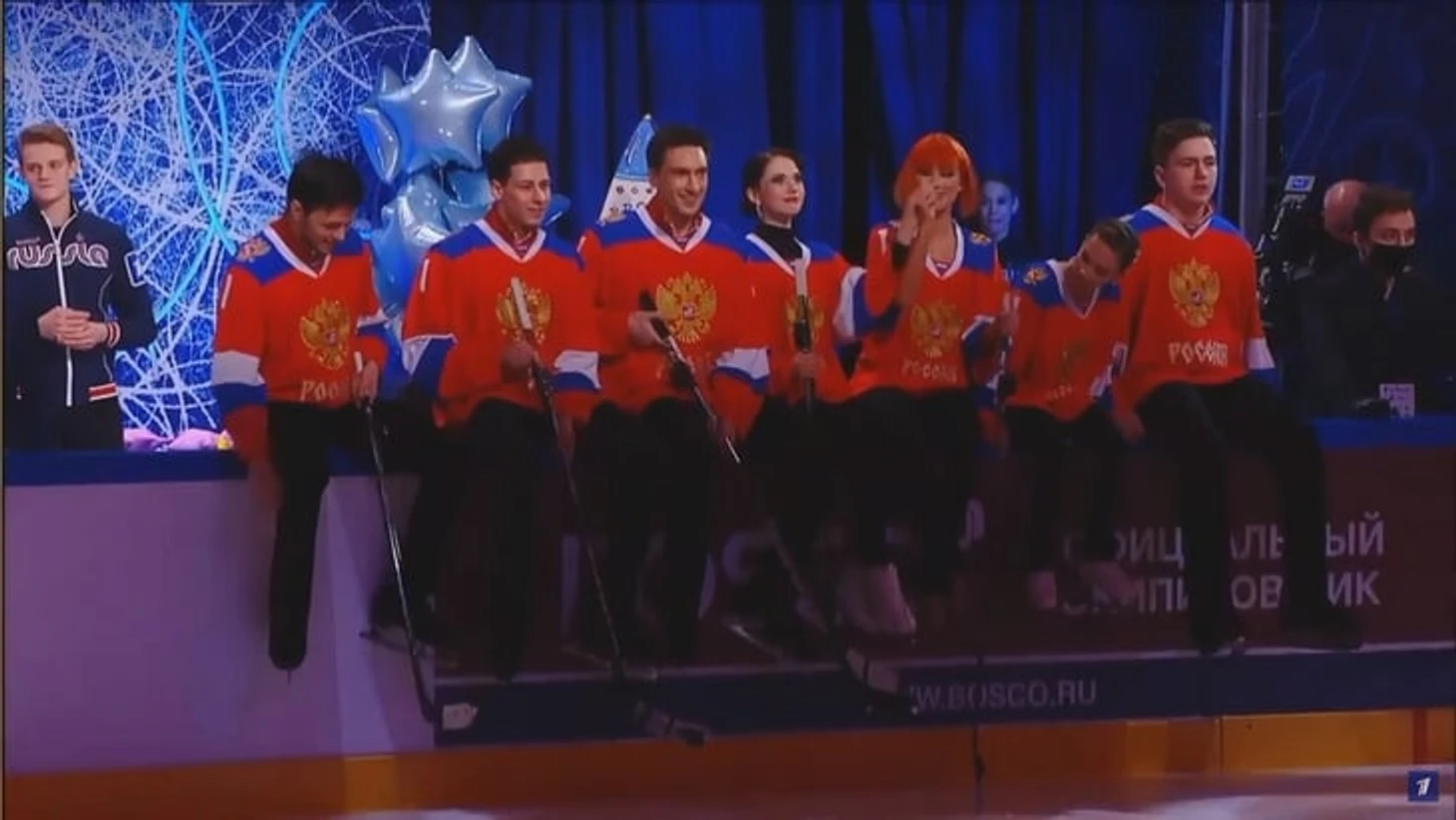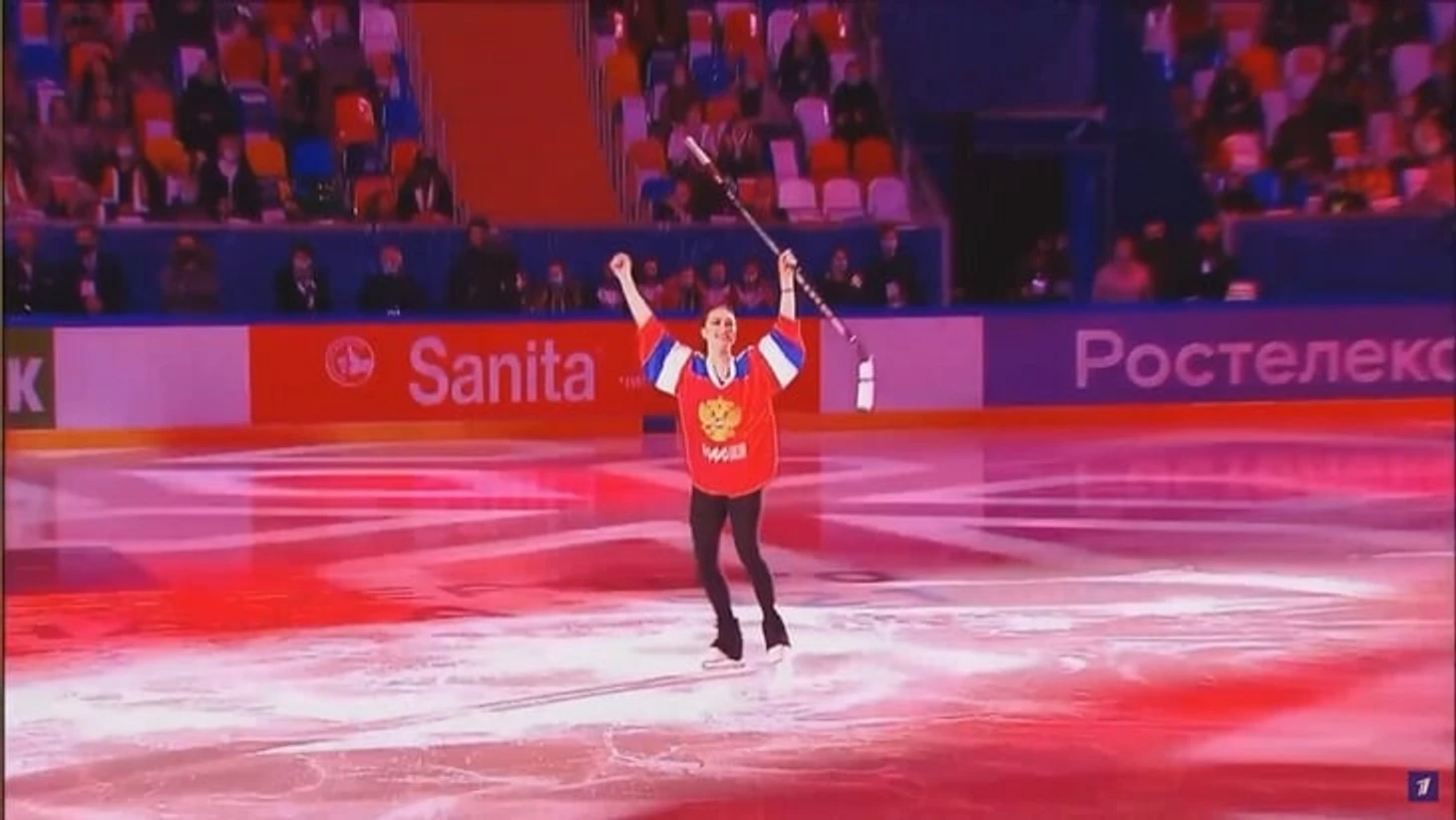 А это выход команды Загитовой – она называется «Красная машина», с приветом хоккеистам.