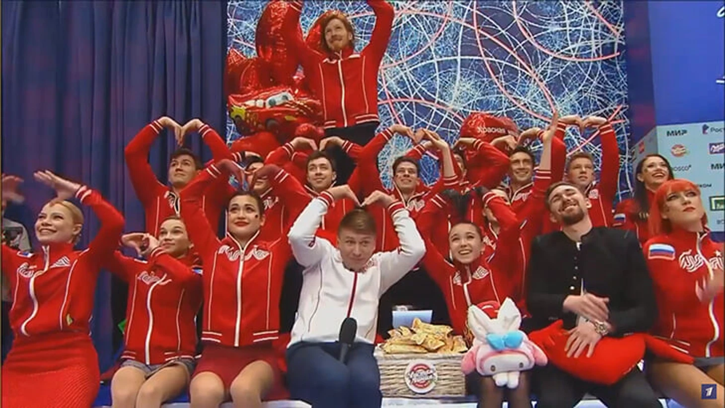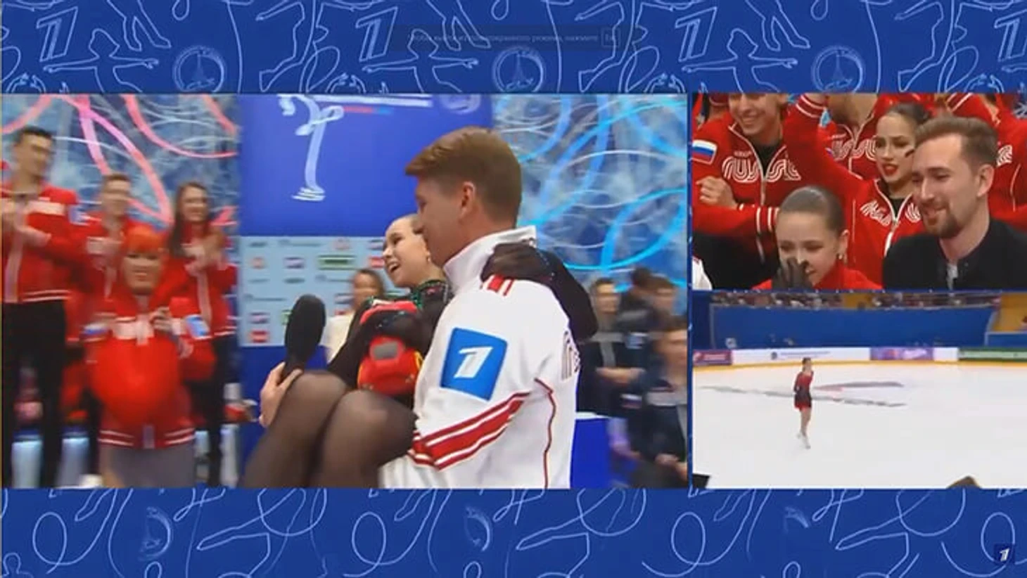 4. Чествование Камилы после проката – отдельный микросюжет. Накануне ведущий Алексей Ягудин выпрашивал у Этери Тутберидзе похвалу для ученицы, вспоминая полушуточную выволочку из декабря.