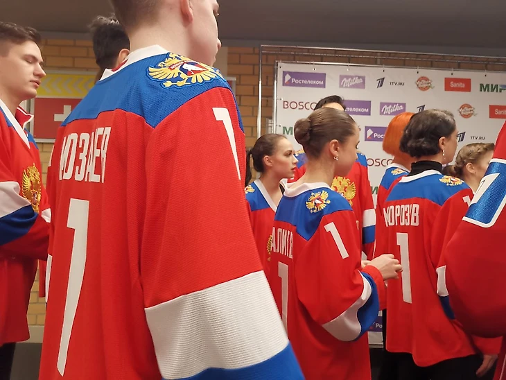 Нельзя не отметить и другой интересный штрих, призывающий победу на сторону "Красной машины" - когда Алина всем фигуристам своей команды наклеила номер 1 на футболки.