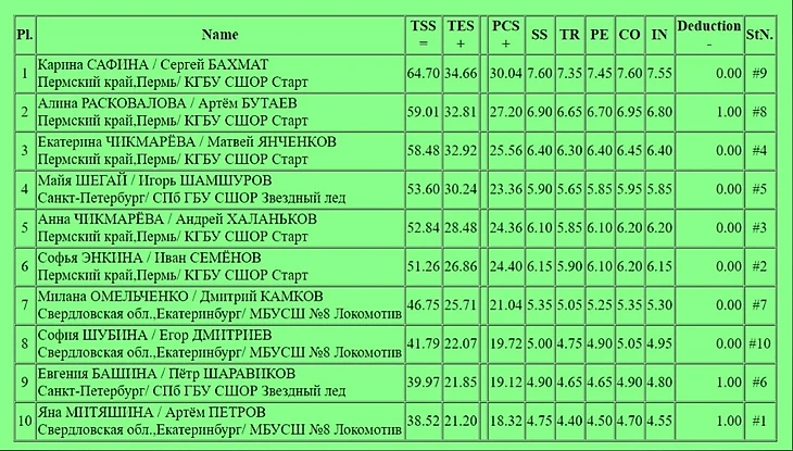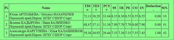 Замкнули турнирную таблицу Александра Каргулина и Илья Калашников. Саша никак не может найти себя в прыжках, как итог - падение с тройного тулупа. К тому же коснулась рукой на приземлении с выброса. Судьи оценили выступление ребят в 59,36 баллов.
