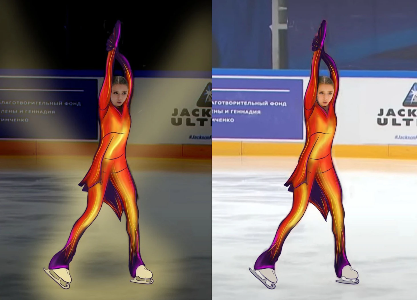 Возьмём один из фрагментов раннего выступления Камилы Валиевой с темой Болеро и преобразуем её костюм в соответствии с моим замыслом.