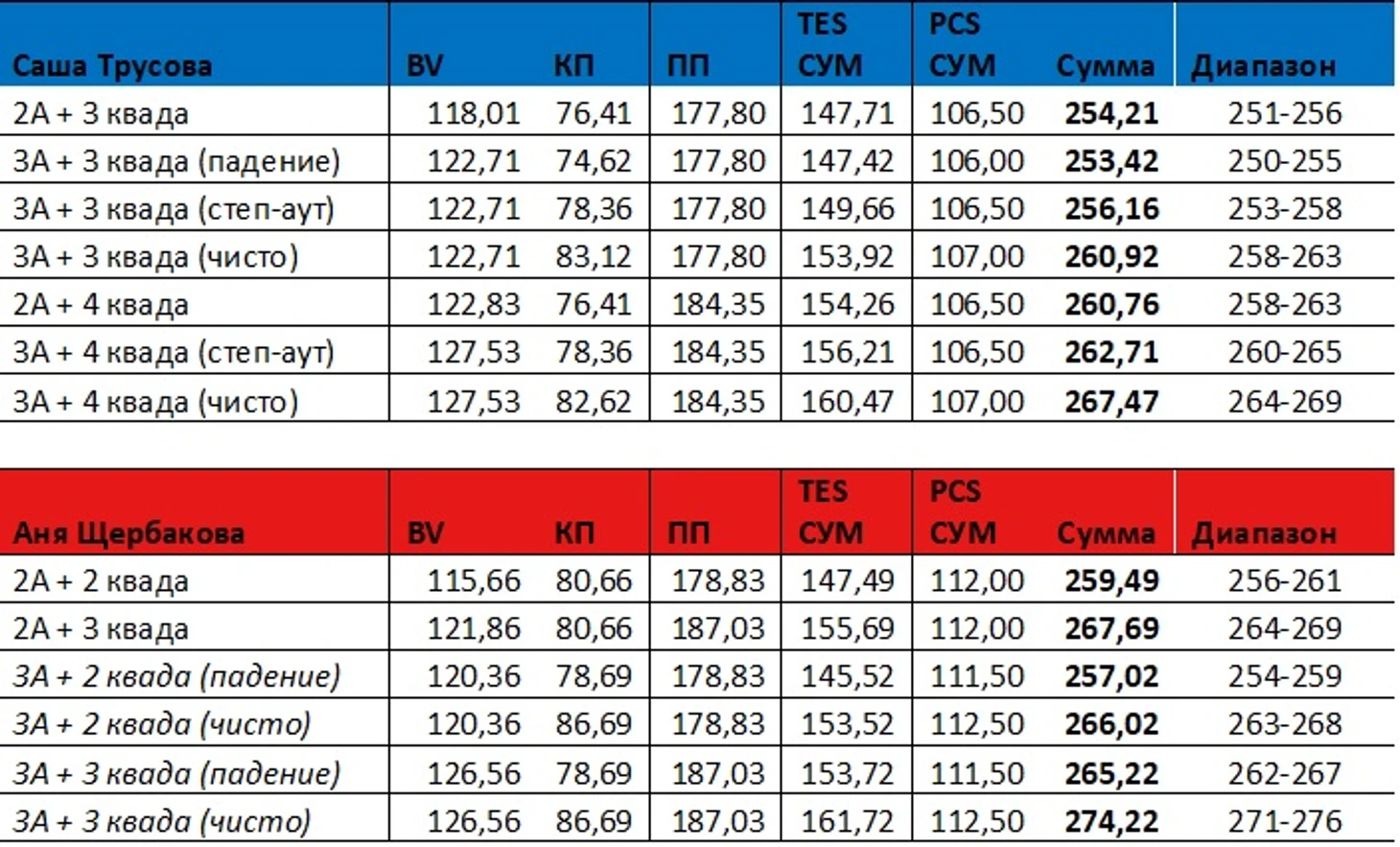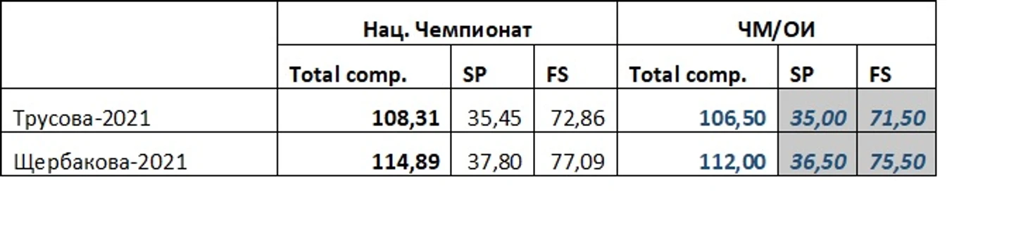 В этом посте я попробую проанализировать цифры, чтобы взяв в руки калькулятор и отбросив эмоции, посчитать, каких оценок можно ожидать от судей в случае идеальных (или близких к идеально чистым) прокатов Трусовой и Щербаковой и какой контент им нужен для гарантированной победы друг над другом.