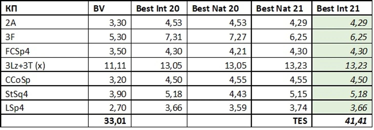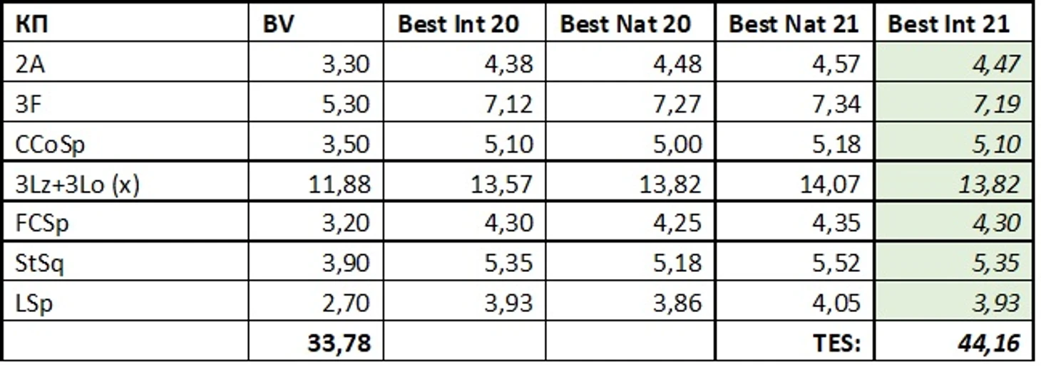 Поэтому я выбрал другой путь – для каждого элемента я нашел максимальную оценку по сезону на внутренних и международных стартах и взял ее в качестве ориентира. В случае, если оценки внутреннего старта этого сезона не превосходят международную оценку, то в зачет идет международная оценка прошлого сезона (считаем, что элемент не улучшился). Если внутренняя оценка этого сезона выше внутренней оценки прошлого сезона (и обе выше международной), то к международной оценки прибавим примерно ту же разницу.