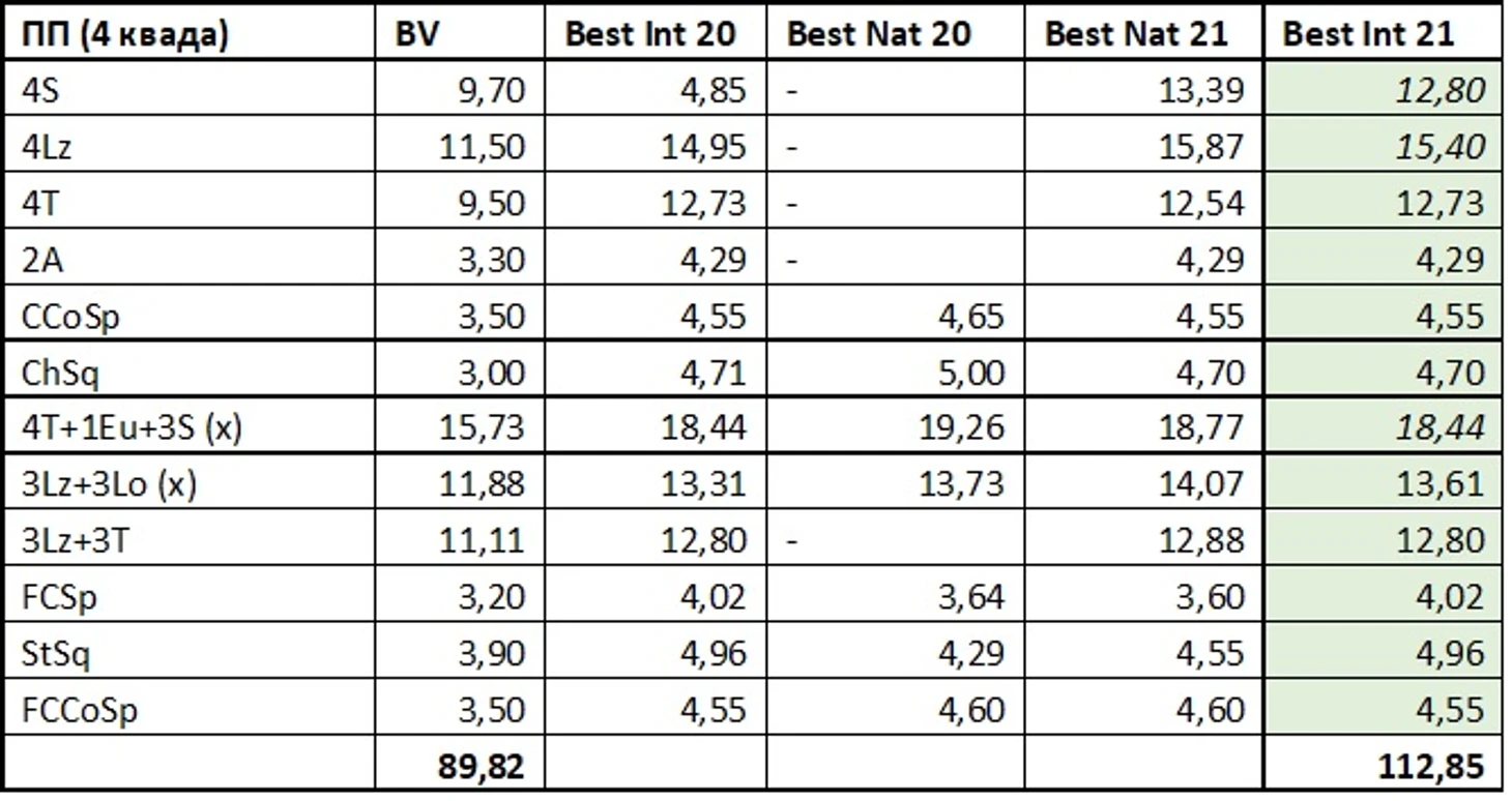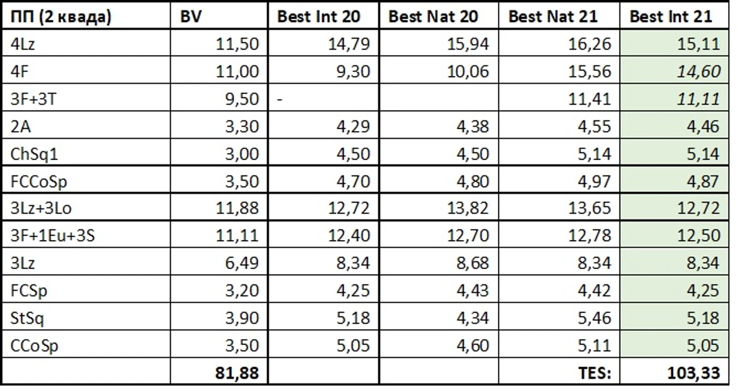 Бред, снова воскликнут внимательные трусоботы и плющеботы, Аня никогда таких оценок на международке не получала и получить не может! Напомню, мои дорогие, что я брал исключительно реально набранные баллы за отдельно взятые элементы и у Саши, и у Ани на международных стартах. А если хотите проверить цифры на вменяемость, то вот вам маленькое и простое упражнение: берем ПП Ани с финала Гран-при 2019 – 94,52 за технику. Вычтем 8,81 и 5,5 за недокрученный лутц и падение на флипе, добавим балл дедакшена и получим 81,21 для остальных элементов. А теперь добавим 14,5 и 14 баллов за чистые лутц и флип. Получим 109,71 и это всего на 2 балла меньше прогнозных 111,53.