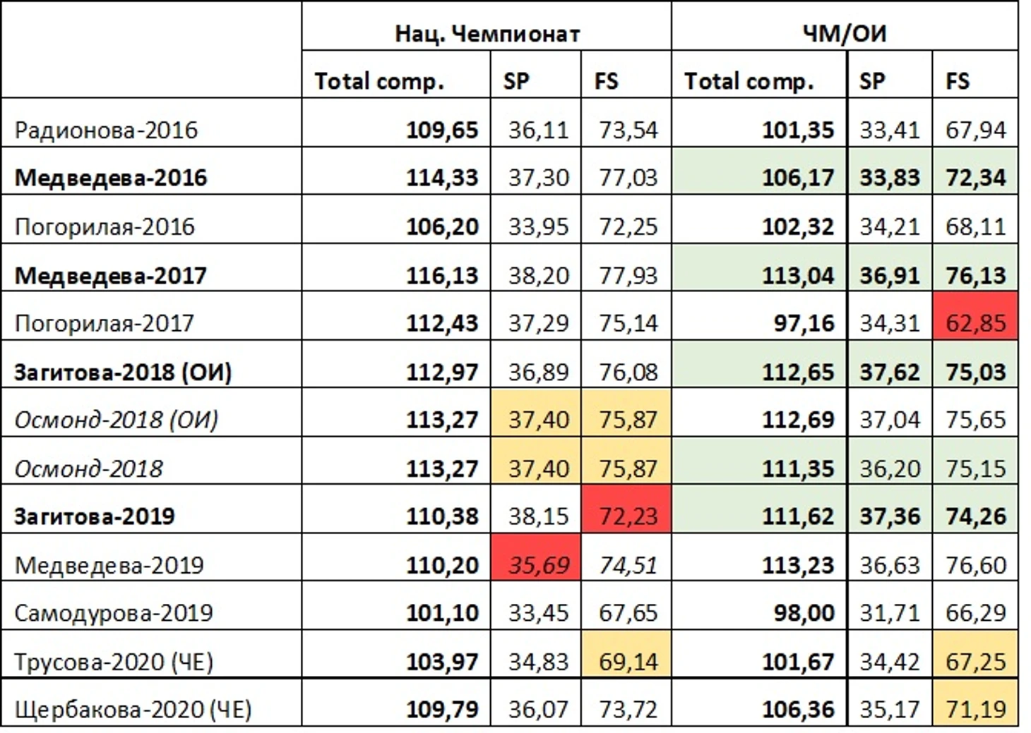 Для того, чтобы понять, каких компонентов ожидать от девочек на ЧМ, определим сначала нижнюю и верхнюю границы. Очевидно, нижней границей для обеих будут лучшие оценки прошлого сезона, а именно ЧЕ. Верхней же границей будут их нынешние оценки на ЧР, где обе откатали чисто и сильно облегчили нам задачу расчета.