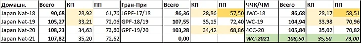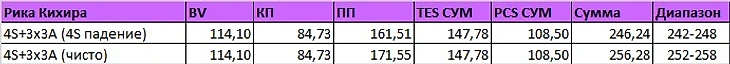Шансов собрать две программы с четырьмя ультра-си у Рики крайне немного. Даже по чемпионату Японии видно, насколько тяжело ей было выкатать квадсальхов и два трикселя на две программы. Тем не менее, мы закладываемся на идеально чистый прокат, а в этом случае баллы у Рики могут быть вот такие (в качестве варианта ошибки выбрал падение с квадсальхова):