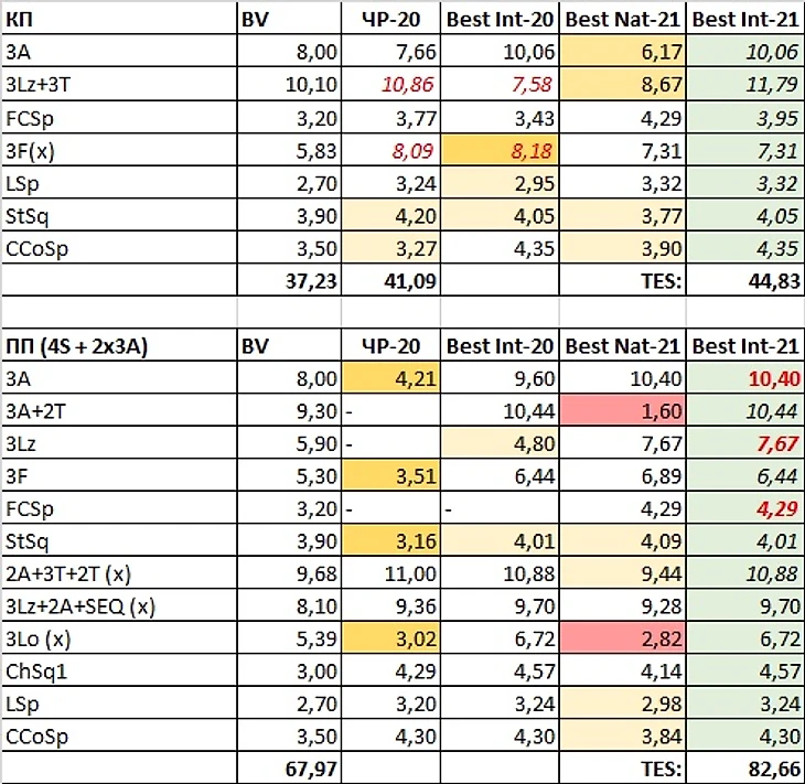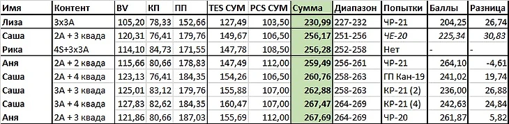 Конечно, реальные оценки даже при чистом исполнении будут скорее всего ниже, ведь при исполнении столь сложных программ обязательно будет потеря концентрации и контроля на более простых элементах. Но рассмотрение потенциального максимума как раз и дает нам возможность посмотреть, насколько близко может быть идеальный прокат Рики к баллам Саши и Ани, даже если они выполнят свой максимум.
