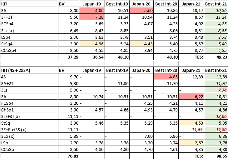 Как видим, оценивать максимально возможные баллы японки не так-то просто – в отличие от той же Анны у Рики контент и компоновка элементов сильно меняется по сезонам. Лутц то появлялся, то исчезал, варьировались вращения, каскад во второй половине и сольные прыжки. Из таблицы видно, что Кихира очень сильна во всех элементах, у нее нет слабых мест в технике, причем она почти всегда катает дорожку на 4-й уровень и получает очень высокие ГОЕ за хорео и вращения. Но вот на вращениях она как раз может потерять баллы, иногда теряя на них уровни. Баллы, отмеченные красным – возможные баллы, которые Рика получит, исходя из предположения, что хорошие попытки она стабильно прыгает на +3/+4.