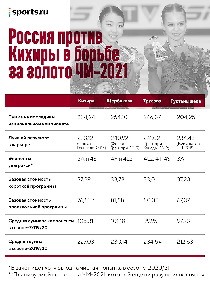 На национальном чемпионате в декабре Кихира получила 234,24 балла – на 30 меньше Щербаковой и на 12 меньше Трусовой. Сравнивать эти оценки бессмысленно: японские цифры максимально близки к международным, а российские судьи весь год выбивали рекорд за рекордом. Та же Щербакова только компонентами за две программы набрала 114,89 – это на 11 баллов больше, чем на ее лучшем международном старте в карьере (ФГП-2019). Кихира же получила вторую оценку, почти до сотой совпадающую с тем, что ей поставили на чемпионате четырех континентов.