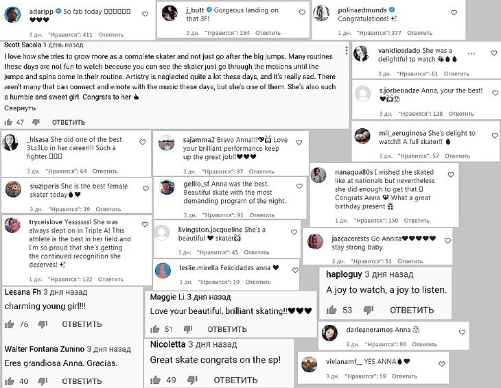 - Полина Эдмундс (американская одиночница, серебряный медалист чемпионатов США 2014 и 2016, участница ОИ 2014 в Сочи) «Поздравляю!», комментарий в инстаграме Ани.