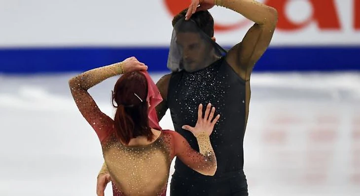 К сожалению, из-за не очень удачного ракурса съемки в трансляции, многие могли не заметить необычность финальной позы в короткой программе у итальянской спортивной пары. А между тем она была аллюзией на известную картину бельгийского художника Рене Магритта "Влюбленные".