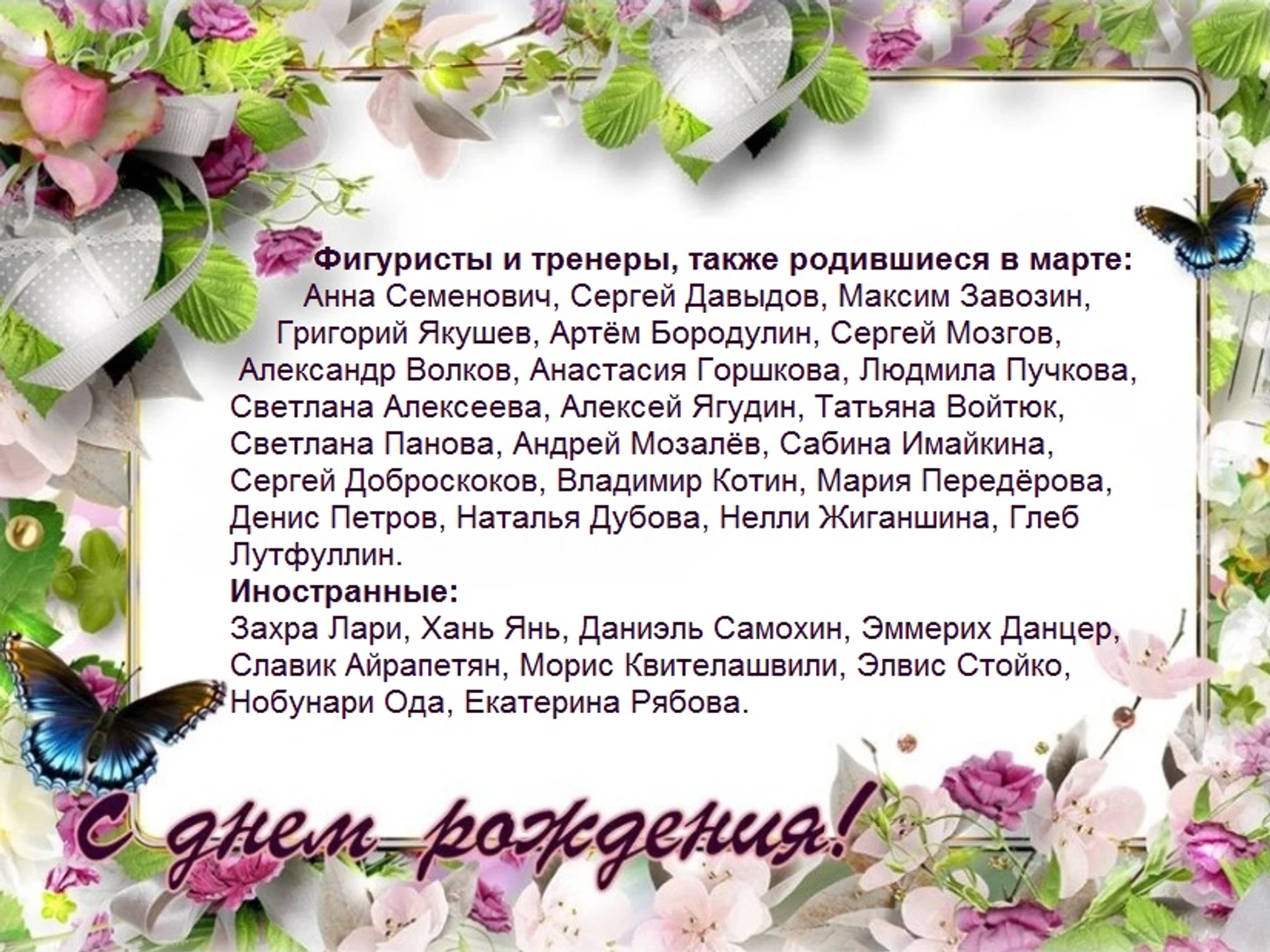 Весна – самое ожидаемое и любимое время года. С наступлением весенних дней природа оживает и преображается: тает снег, звонко бегут ручьи, расцветают первые весенние цветы – подснежники. В первый месяц весны родились фигуристы, которым посвящается этот пост.