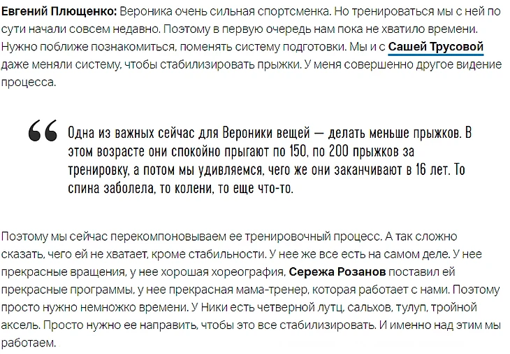 Хотя... В процессе написания этого поста я нашла статью, где приводятся слова Плющенко о тренировочном процессе Вероники, из которых уже что-то проясняется.