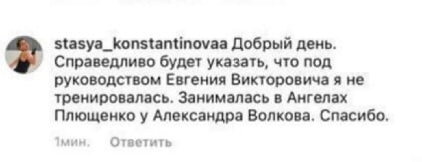 «Добрый день. Справедливо будет указать, что под руководством Евгения Викторовича я не тренировалась. Занималась в Ангелах Плющенко у Александра Волкова. Спасибо», – написала Станислава Константинова.