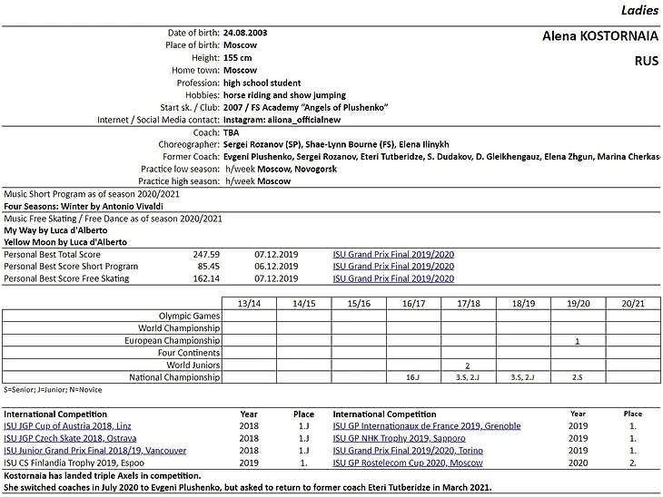 2) По словам официального аккаунта «Ангелов Плющенко» Алена Косторная, Владимир Литвинцев и Леонид Свириденко в сезоне-2020/21 тренировались в группе Сергея Розанова.