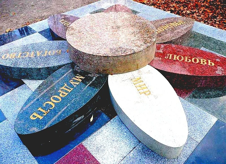 Эта композиция с лепестками на самом деле является памятником «Цветику-семицветику» - волшебному цветку из сказки, способному исполнять любые желания. По примете, прикоснувшись к ним, каждый может «призвать» в свою жизнь недостающие для полного счастья составляющие. Такая возможность ныне есть и у Алины, если вдруг она сама считает, что в её жизни чего-то недостает.
