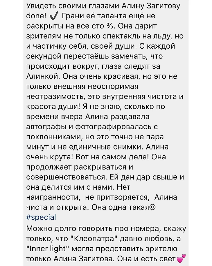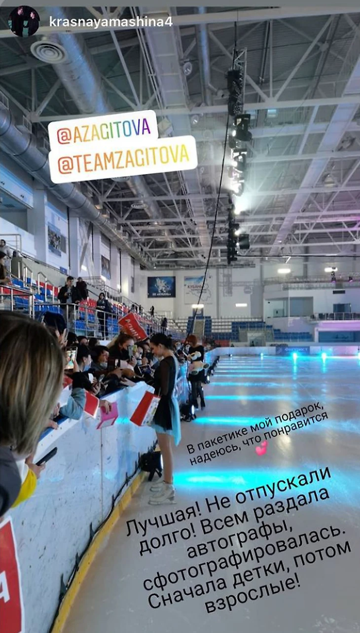 "А Л И Н А Вот и сбылась моя маленькая, но долгожданная и очень желаемая мечта! Не в первый раз увидела вживую нашу Алинку,и вновь она меня очаровала и восхитила!Магия на льду,волшебство! Приковывает к себе взгляд и ведёт за собой до самого конца выступления!Другие фигуристы-прекрасны,но Алина такая одна!Для меня точно - единственная и неповторимая!в отличие от соревнований, я смогла насладиться спокойно ее катанием,не переживая за прыжки с замиранием сердца.Клеопатра вживую много лучше смотрится, чем на экране телевизора!и конечно, то,что Алинка и сфотографировалась со мной,и дала автограф (фото ,кстати,лежало и ждало автографа с чемпионата России с декабря 2018 в Саранске)-это было апогеем вечера и ,вообще, всей истории моего увлечения фигуркой!Я надеялась,но мало верила,что мне удастся.Спасибо тебе ,Алина, @azagitova ,за то,что ты есть ,и радуешь нас,болельщиков! Благодарю @teamzagitova за то,что они делают для Алины и ее большой армии болельщиков))) Сделала сама сердечко -отличительный знак болельщиков #teamzagitova . Хочу ,чтобы Алина выступала ещё долго-долго!!! #алиназагитова #фигурноекатаниероссия #фигурка #краснодар #icepalace #мечтысбываются не только благодаря Газпрому" (подробнее можно посмотреть отзыв здесь https://www.instagram.com/p/CN2U-MKpFkT/?utm_source=ig_web_copy_link