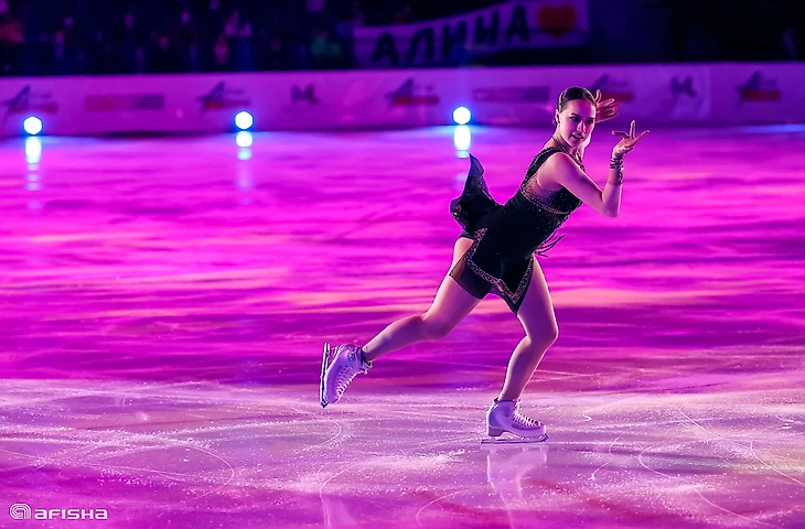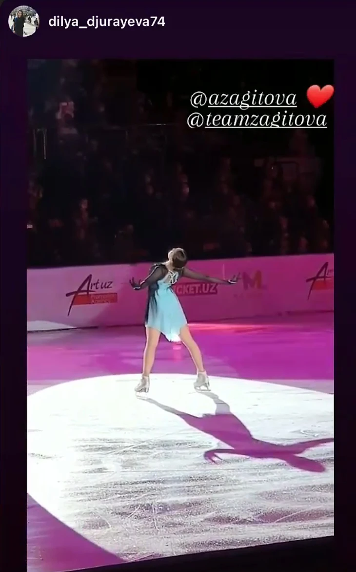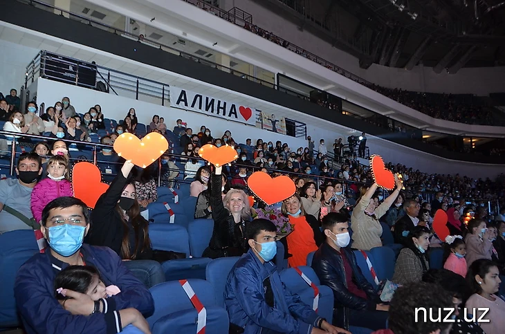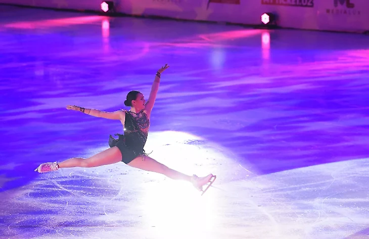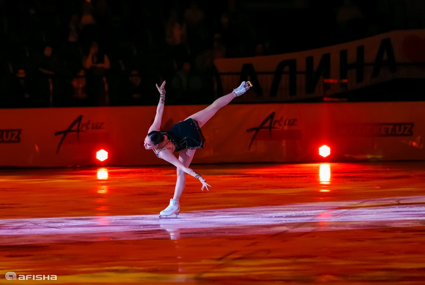 "Закрыла шоу первая российская фигуристка, имеющая все титулы в мировом фигурном катании — Олимпийская Чемпионка 2018 года, Чемпионка мира 2019 — Алина Загитова. В своей программе для Ташкента она показала номера «Клеопатра» и «Внутренний свет». Ее выступления зрители ждали с особым трепетом: растянули плакаты с именем фигуристки, а после ее завершающего выступления на лед полетели плюшевые алые сердца. Некоторым фанатам удалось подарить Алине большие букеты роз" https://www.afisha.uz/gorod/2021/04/29/tutberidze-show/