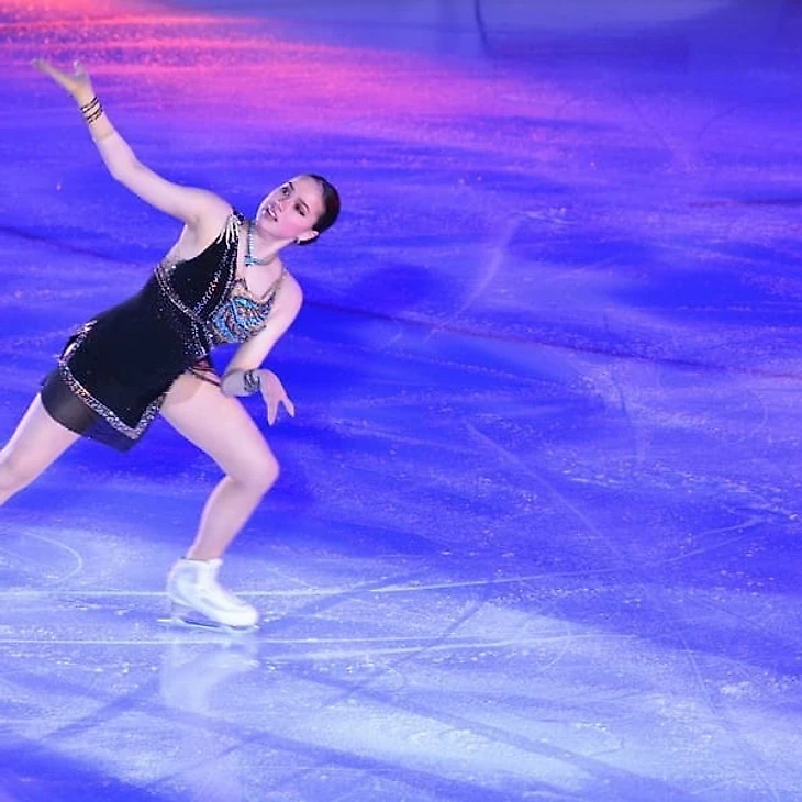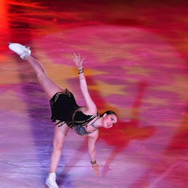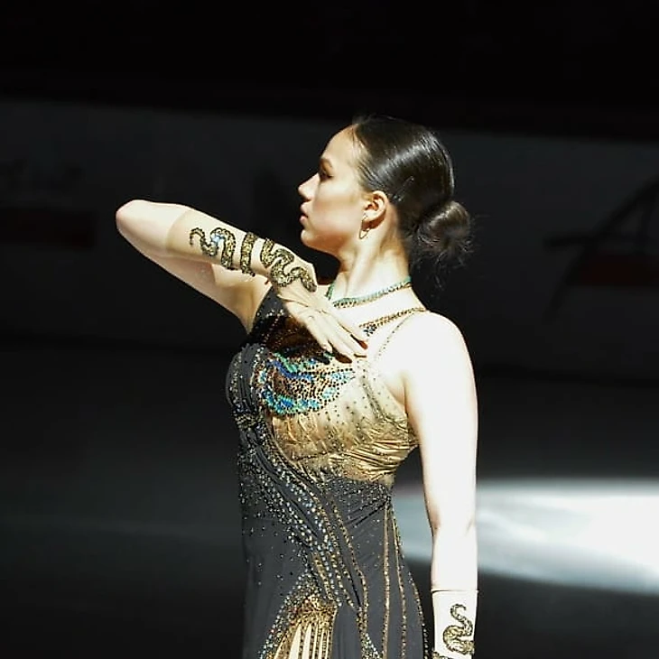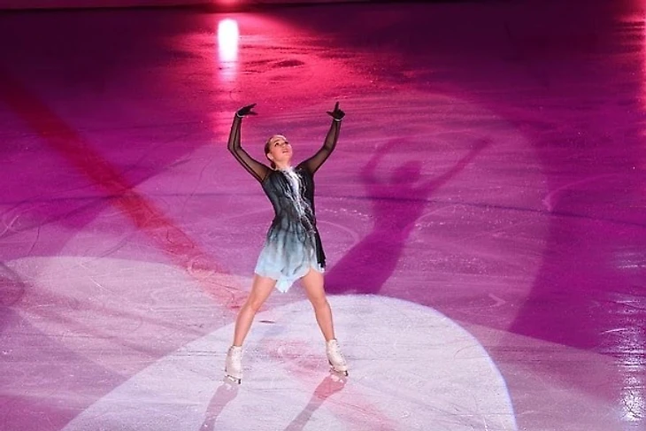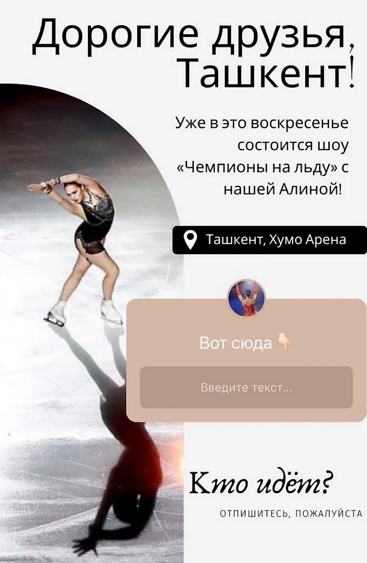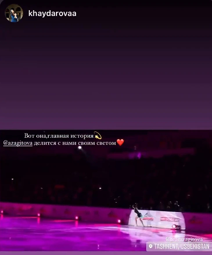 "Закрыла шоу первая российская фигуристка, имеющая все титулы в мировом фигурном катании — Олимпийская Чемпионка 2018 года, Чемпионка мира 2019 — Алина Загитова. В своей программе для Ташкента она показала номера «Клеопатра» и «Внутренний свет». Ее выступления зрители ждали с особым трепетом: растянули плакаты с именем фигуристки, а после ее завершающего выступления на лед полетели плюшевые алые сердца. Некоторым фанатам удалось подарить Алине большие букеты роз" https://www.afisha.uz/gorod/2021/04/29/tutberidze-show/
