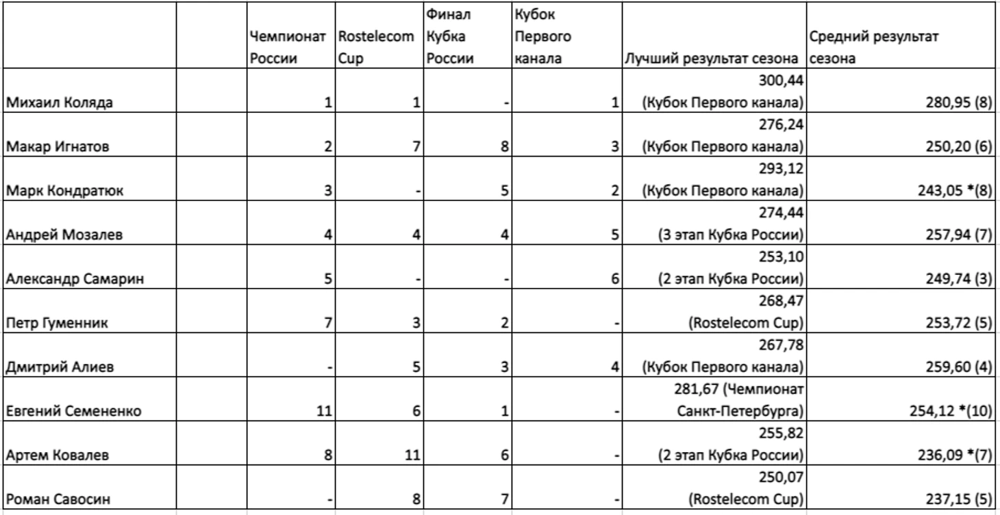 *Средний результат сезона у Кондратюка, Семененко и Ковалева подсчитан с учетом юниорских стартов
