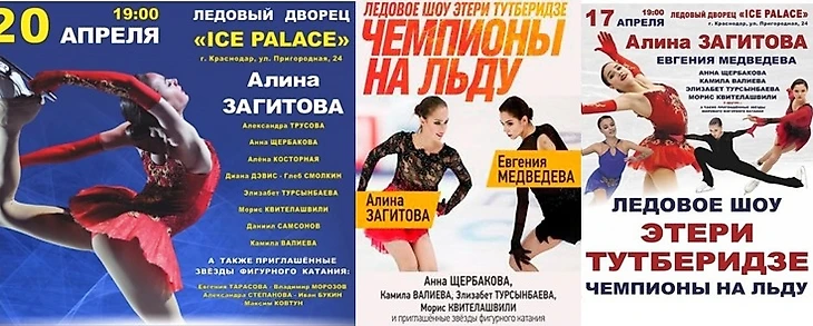 А вообще, куда интереснее было бы делать афиши, допустим, с учетом специфики каждого города. В особенности это хорошо вышло бы с Питером. Берем достопримечательности, думаем, какие из них ассоциируются с фигуристами и их программами, ищем фото с подходящим ракурсами, наслаиваем их в «фотошопе», оформляем: пишем дату, время. И всё. Затрат почти никаких – зато индивидуальный подход с отсылкой к месту, в которое вы приехали.