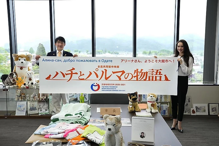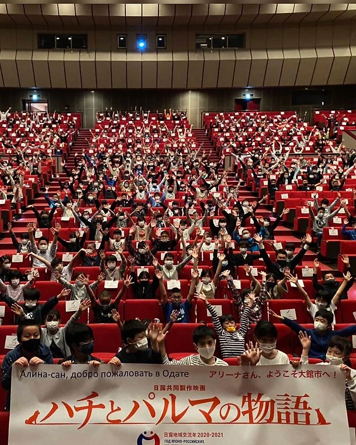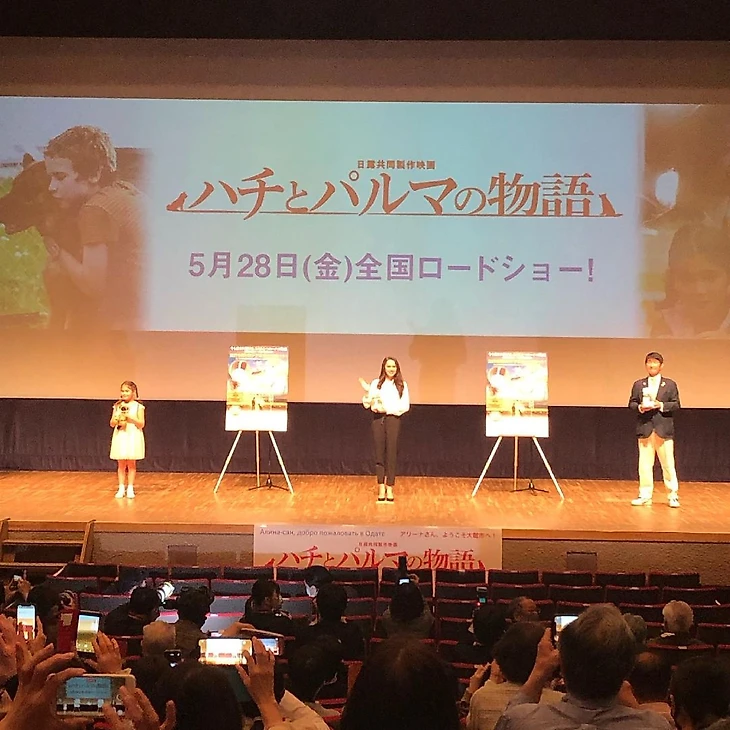 Твиттер Российского посольства в Японии. 23-го числа состоялся предварительный показ фильма совместного производства Японии и России "#История Акиты и Пальмы" в #Японии #Odate City, префектура Акита, и приветствовала российская фигуристка Алина Загитова (19). Загитова также снималась в кино. Фигурное катание #Загитова посетила родной город Акита-ину: