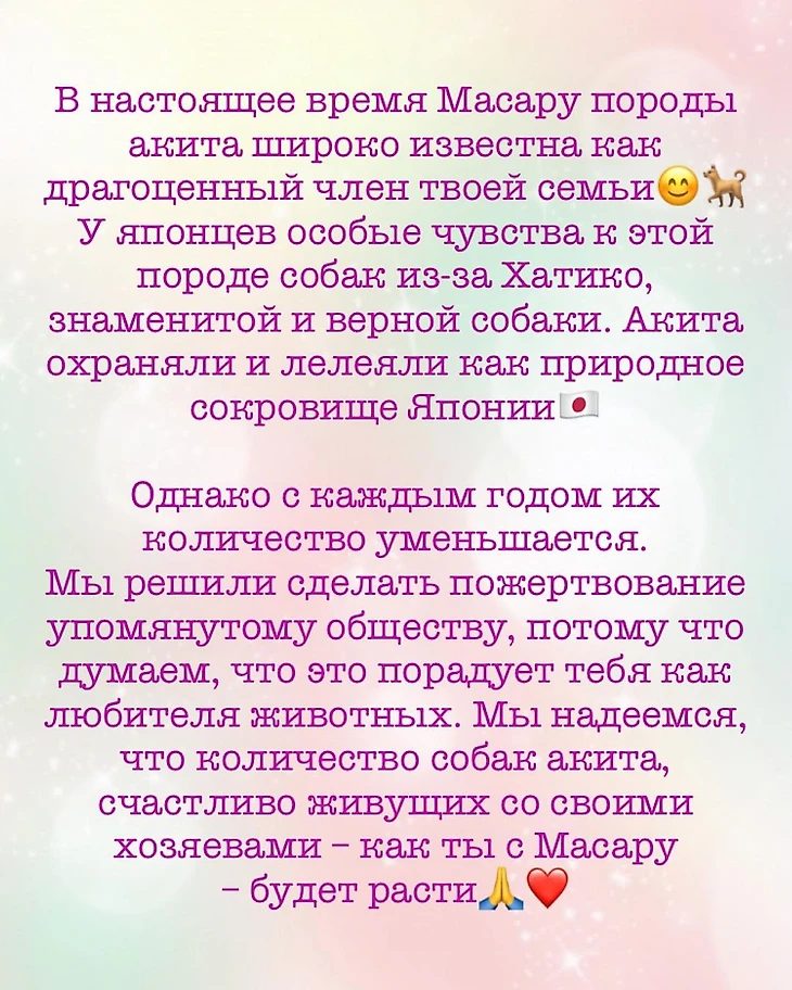 Наши "Японские каникулы" продолжаются, и в преддверии посещения Алиной города Одата, префектуры Акита, откуда родом любимая собака Алины Масару, хочу поместить в пост историю собаки Хачи, прототипа Хатико из одноимённого фильма, а также немного сведений вообще об этой породе собак, взятых с сайта о городе Одата (оригинальный источник статьи и полная статья https://www.city.odate.lg.jp/city/kankou/highlight/animal/p4808/en ) Перевод: Яндекс-переводчик