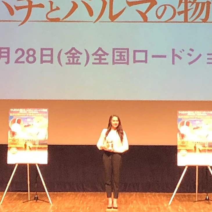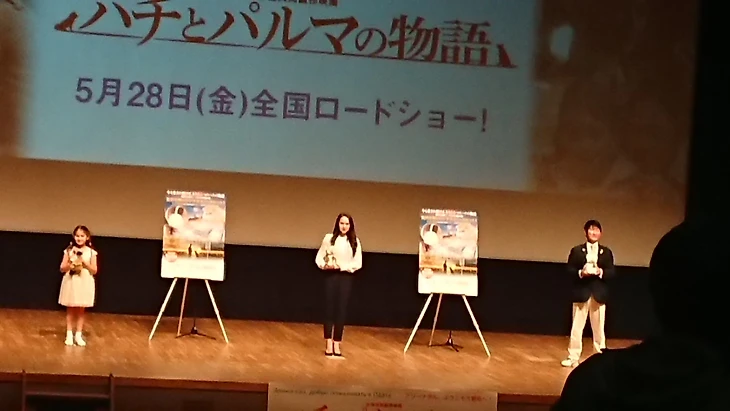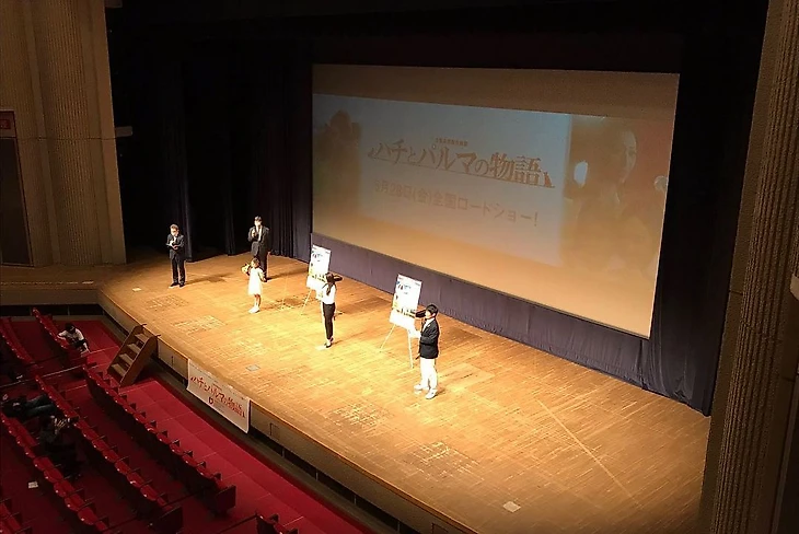 "Сегодняшний зал Хокусика Рокумей-это специальный предварительный показ"Истории Пчелы и Пальмы".Алина Загитова, Анастасия и мэр Фукухара, которые фигурируют в фильме, выступили с сценической речью"