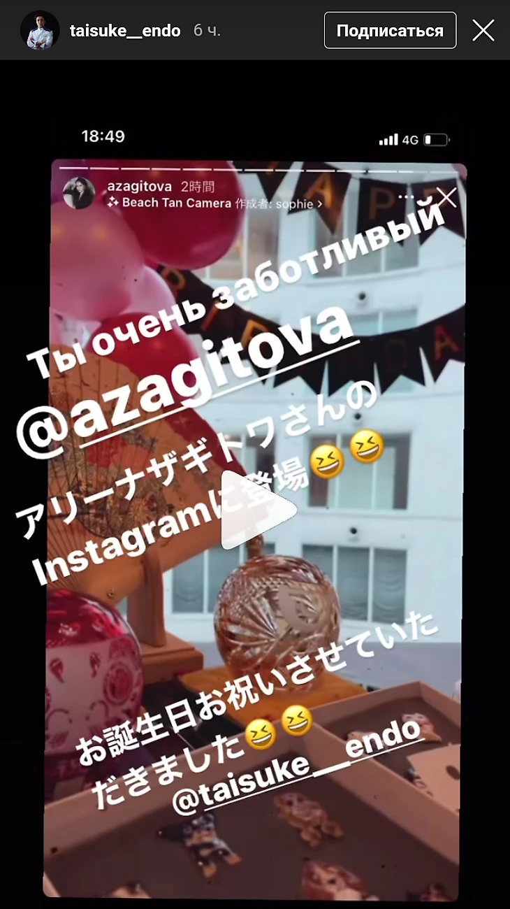 Тайсуке настолько проникся нашей Алиной, что даже в своей сторис перепостил сторис Алины с видео, где он нарезает для неё торт. Классно!