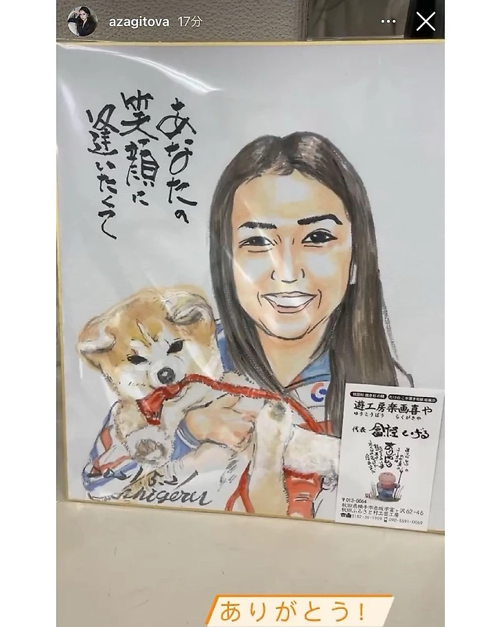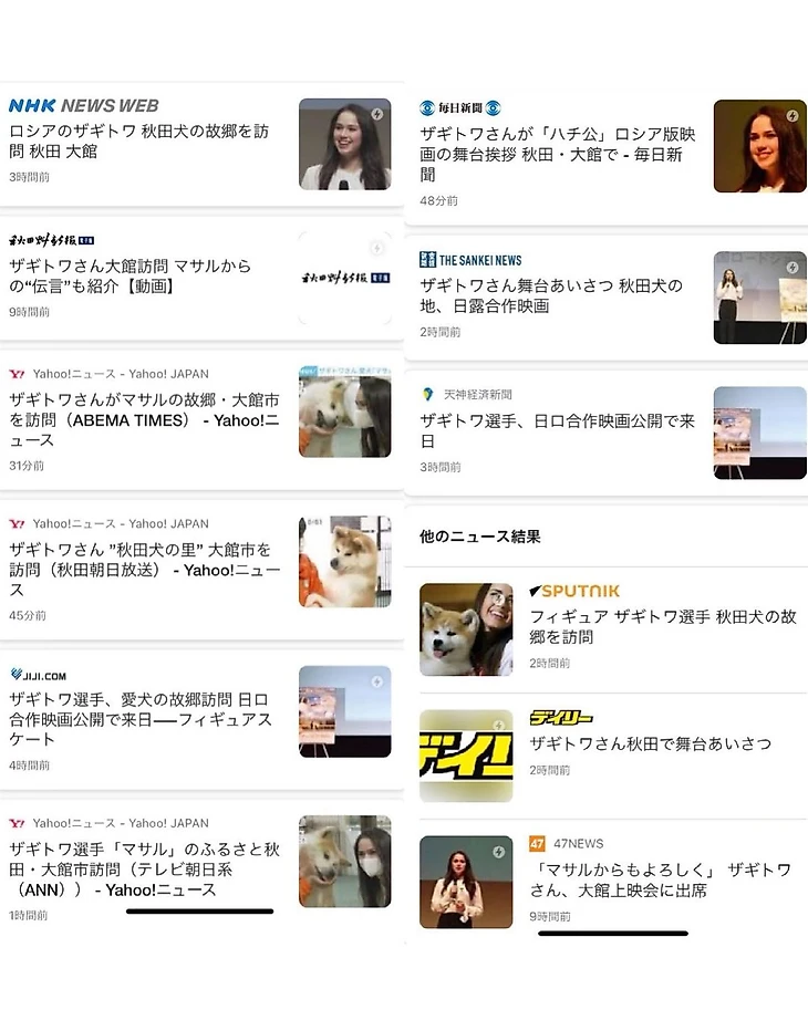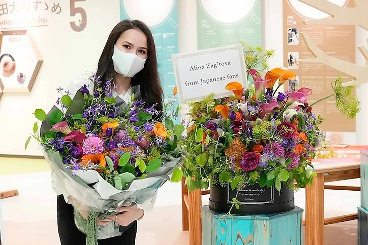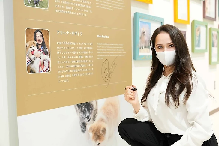 "Золотая медалистка по фигурному катанию Алина Загитова побывала в родном городе своей собаки. Г-н Загитова, золотой призер Олимпийских игр в Пхенчхане по фигурному катанию, посетила город Одатэ в префектуре Акита, чтобы встретить сцену показа фильма «Собака по имени Пальма», в котором он также появился. В 2018 году был представлен «Масару» акита-ину, и г-н Загитова давно хотела побывать в родном городе Акита-ину - Odate City. Г-н Загитова посетил выставочный комплекс Акита-ину и встретился с братом своей собаки Масару, Кацудаем, наблюдал за его энергичным и очаровательным внешним видом и фотографировал"