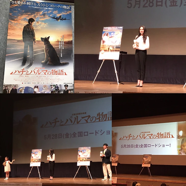 Цель приезда в Японию состояла в том, чтобы быть приглашенным на публичное мероприятие для специального японско-российского фильма"История Пчелы и Пальмы". Чтобы послужить пиаром фильма, который выйдет по всей стране с 5/28, отправляйтесь в город Одате префектуры Акита, где базируется Общество охраны собак Акиты.3 года назад на 5-м месяце Загитовой подарили женское"Масару"Акита-ину от общества охраны природы, и она надеялась, что когда-нибудь ей захочется с благодарностью посетить город Одате.Это желание наконец-то сбылось.Сюжет фильма в точности повторяет русскую версию"Верного пса Хатико".