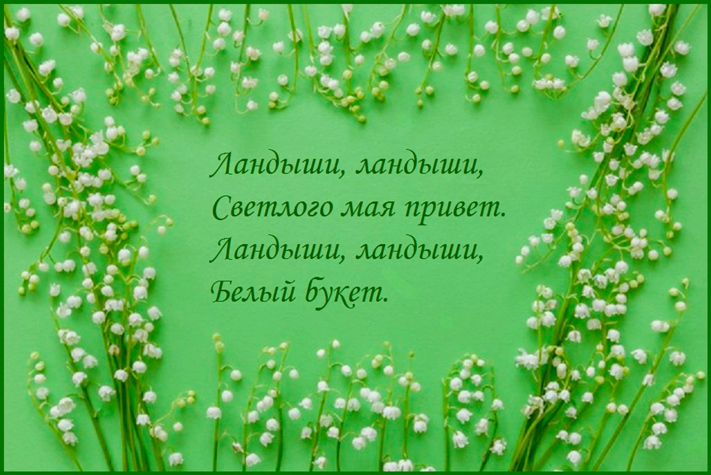 Белоснежный ландыш на полянке Россыпью расцвёл среди травы, И на нём как бусинки на нитке Засверкали капельки росы. Ландыш — символ нежности и мая Юной не порочной красоты, В нём играет солнце, излучая, Тонкий аромат проснувшейся весны, Он цветёт, овеян свежим ветром, И умытый утренним дождём, Весь пронизан и теплом и светом, Красота природы воплотилась в нем. Б. Афанасьев