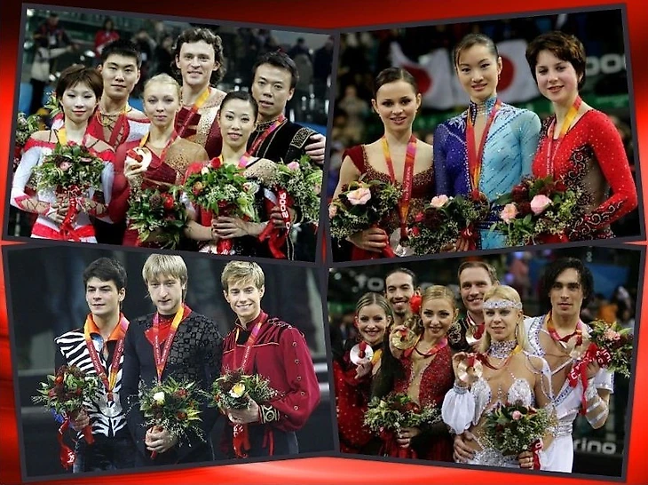 Олимпийские чемпионы-2006: Евгений Плющенко, Татьяна Тотьмянина/Максим Маринин, Сидзука Аракава, Татьяна Навка/Роман Костомаров.