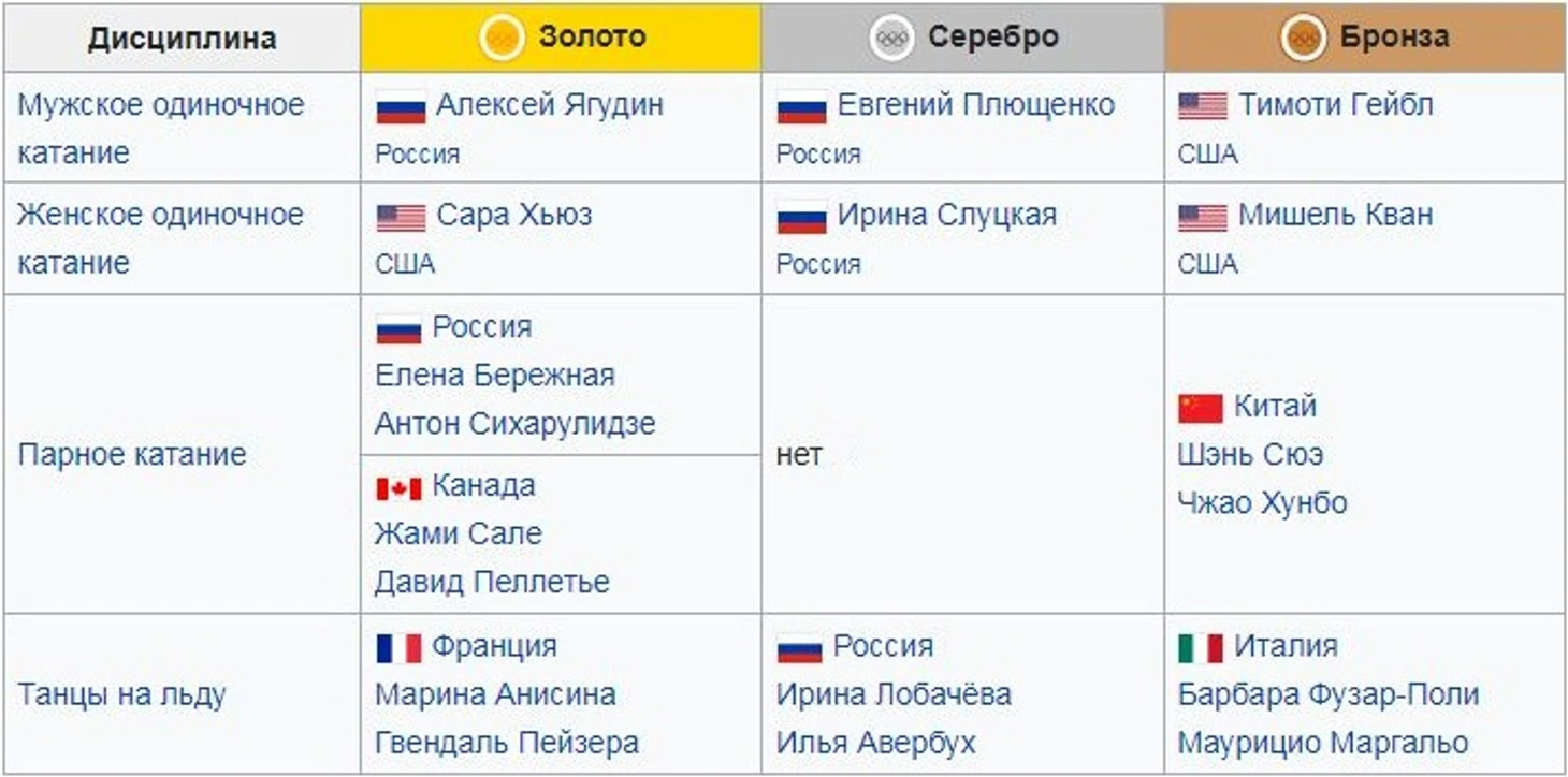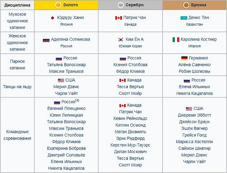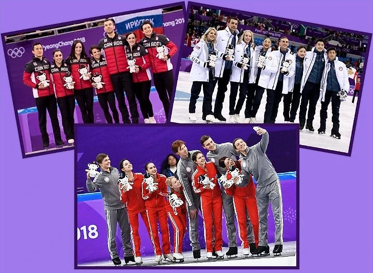 Олимпийские чемпионы в командном соревновании: Елена Ильиных/Никита Кацалапов, Евгений Плющенко, Татьяна Волосожар/Максим Траньков, Юлия Липницкая, Ксения Столбова/Фёдор Климов, Екатерина Боброва/Дмитрий Соловьёв.