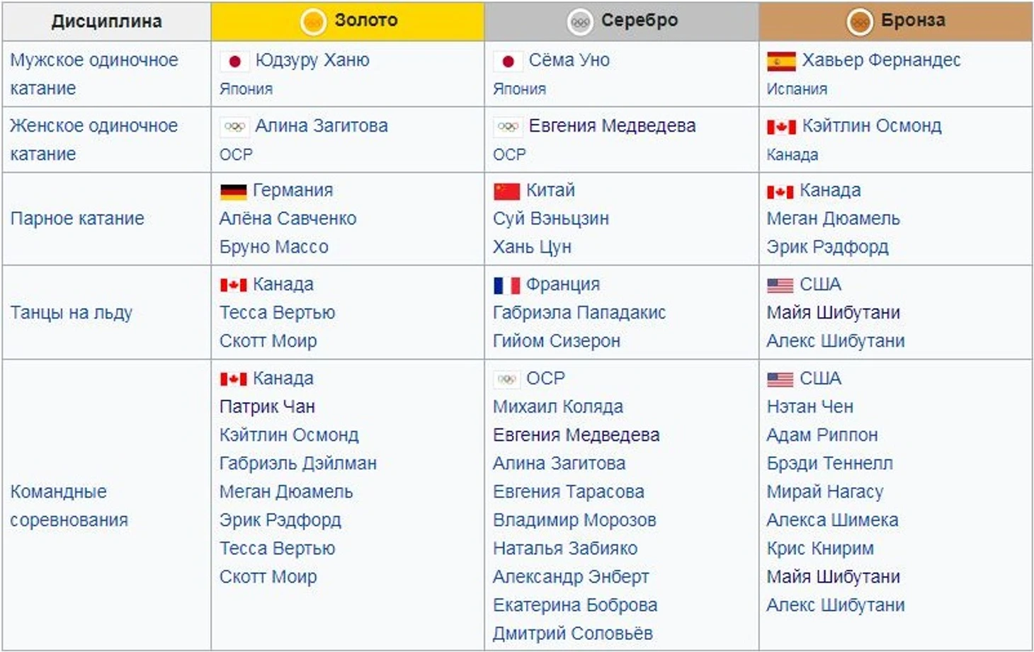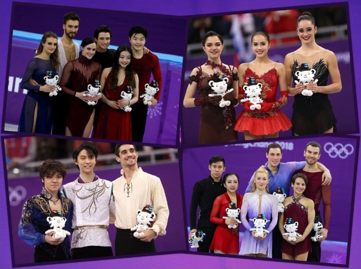 Олимпийские чемпионы-2018: Юдзуру Ханю, Алина Загитова, Тесса Виртью/Скотт Моир, Алёна Савченко/Бруно Массо.