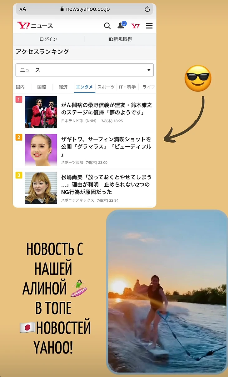 Японцы, как всегда, не прошли мимо нового поста Алины в Инстаграме от 26 июня, где она показывает, как катается на вейкборде(видео из её Тик-тока), и опубликовали сегодня об этом заметку в своём популярном интернет-издании YAHOО