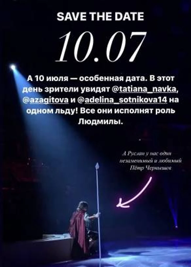 «У каждой из нас свой стиль катания и свое видение образа Людмилы, поэтому я очень советую всем гостям Сочи Парка сходить на сразу несколько наших спектаклей на льду. Более того, 10 июля в Сочи Парке состоится уникальный показ шоу, в котором вместе со мной на лед выйдут Алина Загитова и Аделина Сотникова. Мы по очереди исполним разные сцены из шоу, это будет действительно волшебное и неповторимое представление, которое должен увидеть каждый!», - сообщила автор идеи и продюсер шоу Татьян Навка. https://www.ok-magazine.ru/stars/report/206921-v-parke-sochi-park-sostoyalas-premera-gastrolnogo-tura-myuzikla-na-ldu-ruslan-i-lyudmila