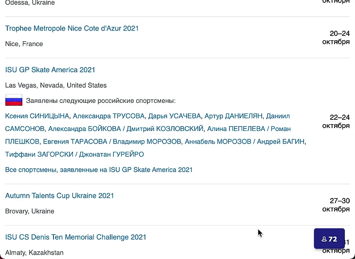 Сегодня объявили спортсменов, заявленных на этапы ISU Гран-При, добавил их в календарь соревнований. Прямо на странице календаря видно, кто заявлен из российских спортсменов, а при переходе на страницу соревнований - полный список заявленных спортсменов. Ссылка на календарь соревнований 2021/2022: https://figure-skaters.ru/events