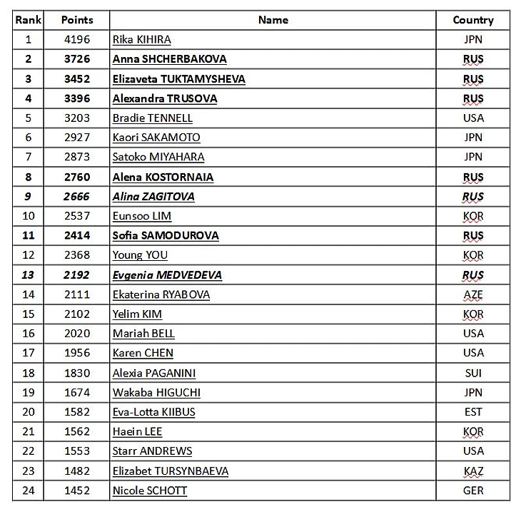 И, наконец, заключительный шаг - заполняются оставшиеся места на этапах. Кого могут пригласить на оставшиеся места? Формально - кого угодно. На практике - берется тот же список Season Best и приглашаются сначала ТОП фигуристки, которые еще не получили по 2 этапа. Если все из ТОП-24 получили по 2 этапа, то приглашают тех, кто ниже 24 места.