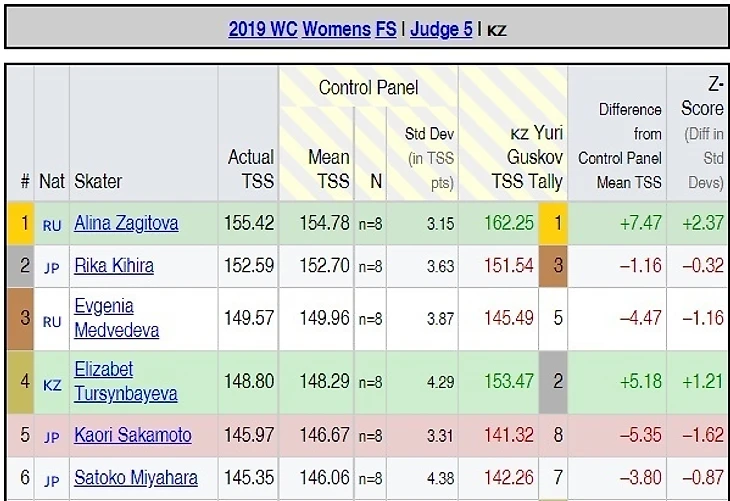 Думаю, что более чем наглядно. Нет смысла всю таблицу приводить. Ведь весь интерес представляют только первая 5-ка или 6-ка претендентов на медали. Может кого-то он и честно судил из второй десятки. Но первую 5-ку явно нет. Не трудно подсчитать, что этот судья подарил второе место Турсынбаевой и обеспечил более заметный отрыв Алине Загитовой от соперниц. Лишил Медведеву честного серебра, а Рику Кихиру бронзовой медали. А Турсынбаева вообще с не исполненным каскадом (там не было падения или другой ошибки, нет. Все просто. Нет каскада, нет падений) оказалась чудесным образом второй. А нам рассказали только о чудесном 4-м сальхове. А сайт ФФКР и поздравил Турсынбаеву (привет Ольге Ермолиной). Немножко подзабыв, что она представляла другую страну, а нашу страну представляла Евгения Медведева.