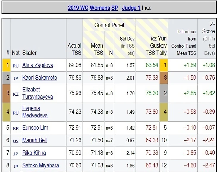 Не буду долго разбирать протоколы. Оценки представлены в более наглядном виде как судья ранжирует фигуристок. В этом нам помогает замечательный ресурс skatingscores.